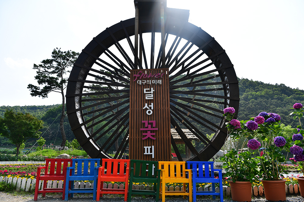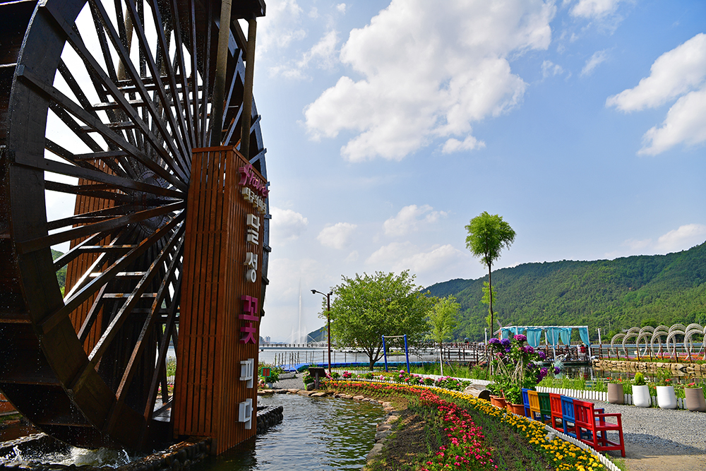 먼저 물레방아가 있는 곳으로 가봅니다. 예쁜 꽃들과 의자가 있어 사진찍기 참 좋은 곳입니다. 물레방아를 배경으로 예쁜 모습을 담아 봅니다. ㅎㅎ