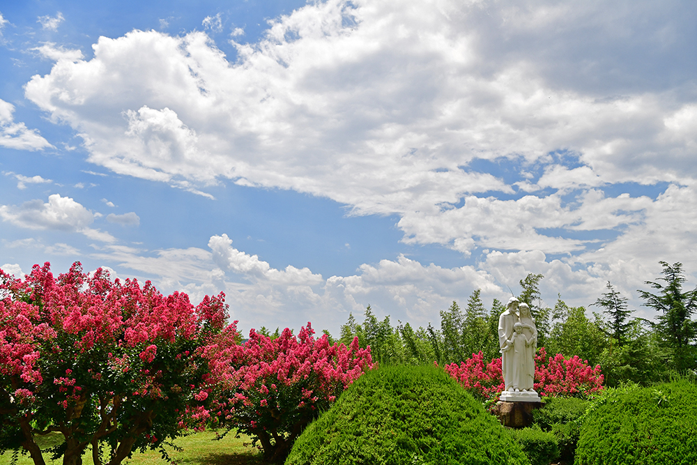 성당을 배경으로 배롱나무를 담아봅니다. 성당과 배롱나무가 어우러진 모습에서 이국적인 분위기가 물쒼납니다. 배롱나무가 어느 곳이나 잘 어울리는 것 같습니다. ㅎㅎ