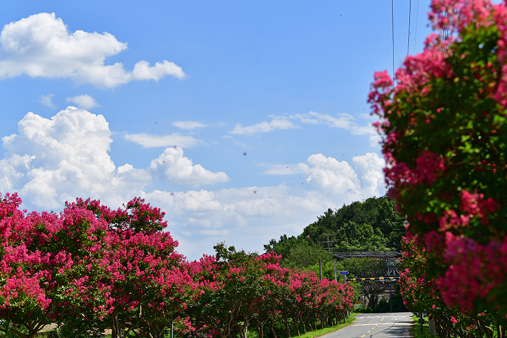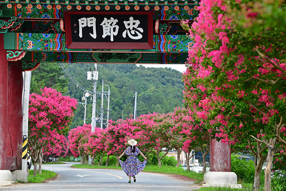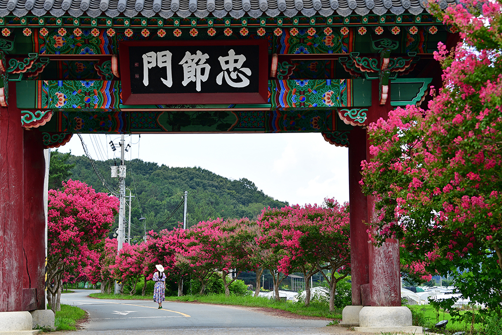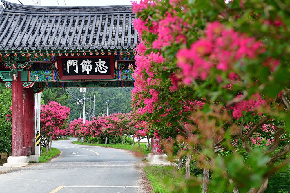 육신사를 둘러본 후 본격적으로 배롱나무를 즐기기 위해 도로변으로 내려왔습니다. 도로 중간에 있는 충절문 주변 갓길에 주차한 후 배롱나무 길을 살펴 봅니다. 한적한 모습의 도로가 너무 좋습니다. ㅎㅎ