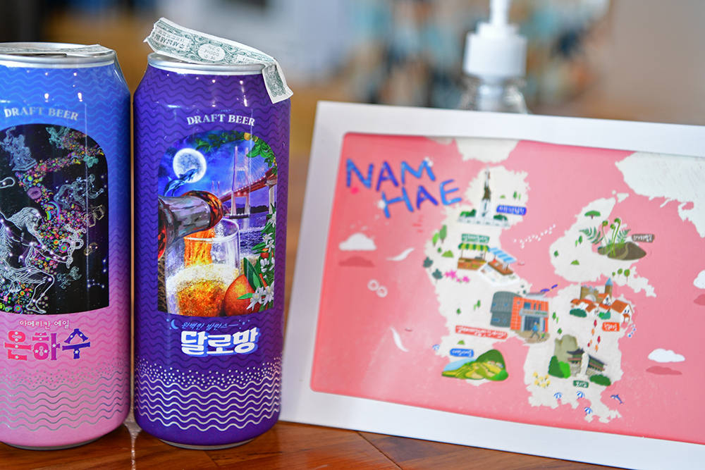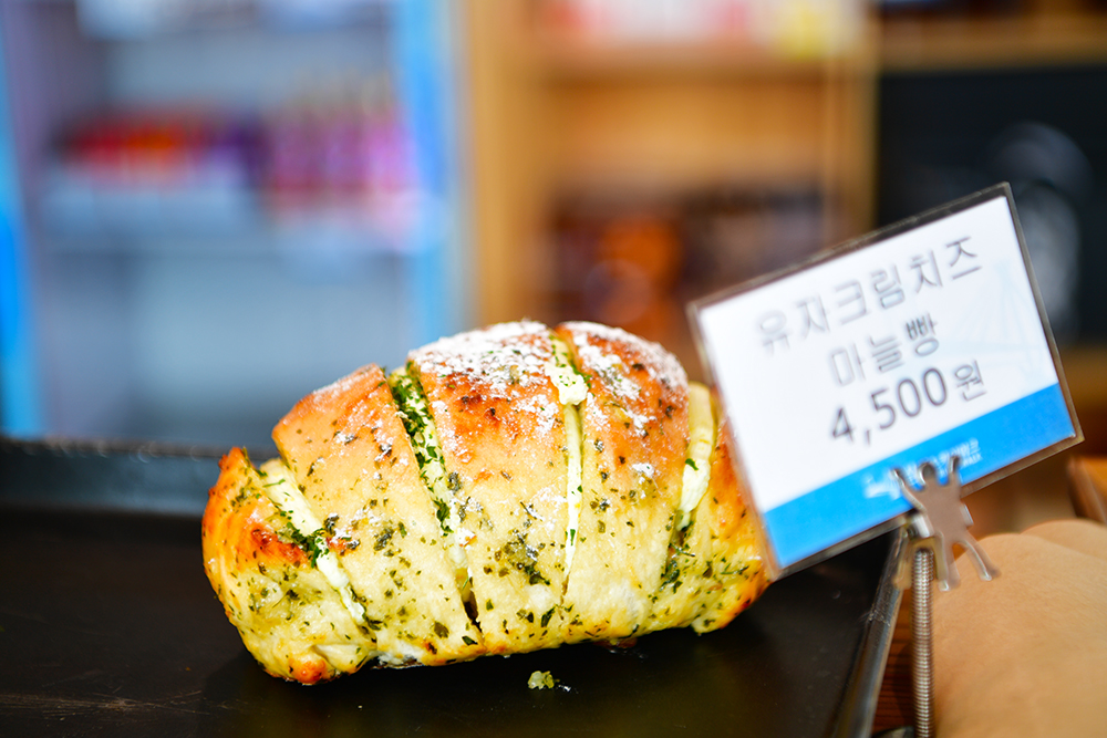 스카이워크를 즐긴 후 더위도 식힐 겸 하여 카페를 찾았습니다. 남해 특산물인 유자가 들어간 크림치즈 마늘빵과 수제 맥주를 판매 중입니다. 물론 커피도 있습니다. 하지만 조금의 고민도 없이 마늘빵과 수제맥주, 아이스크림을 구매했습니다. ㅎ