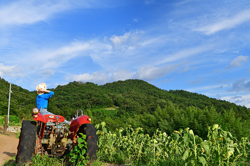 많은 분들께서 이 곳의 랜드마크로 풍차를 생각합니다. 노란 해바라기와 붉은 풍차가 잘 어울리니 그럴만도 합니다. 하지만 저는 붉은 경운기라 생각합니다. 비록 오래되고 낡아 움지이지 않지만, 예전부터 이곳을 지켜온 터줏대감같이기 때문입니다. ㅋ