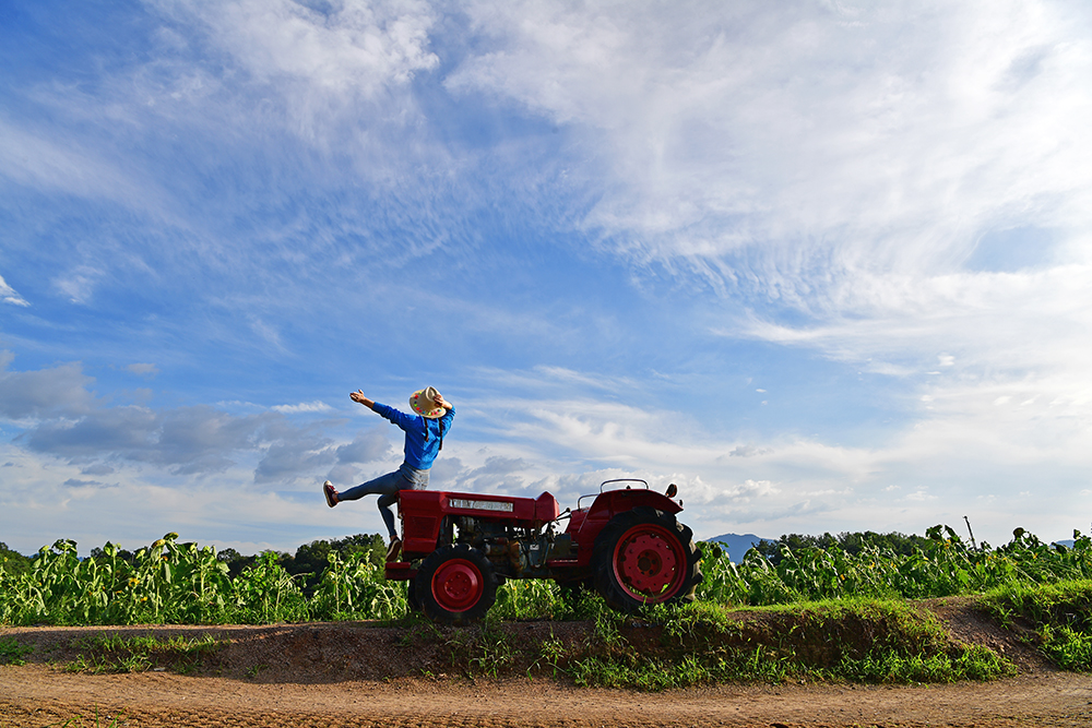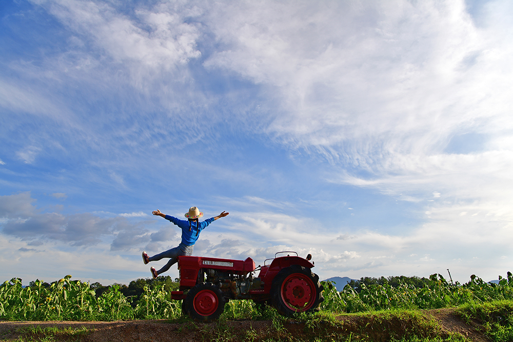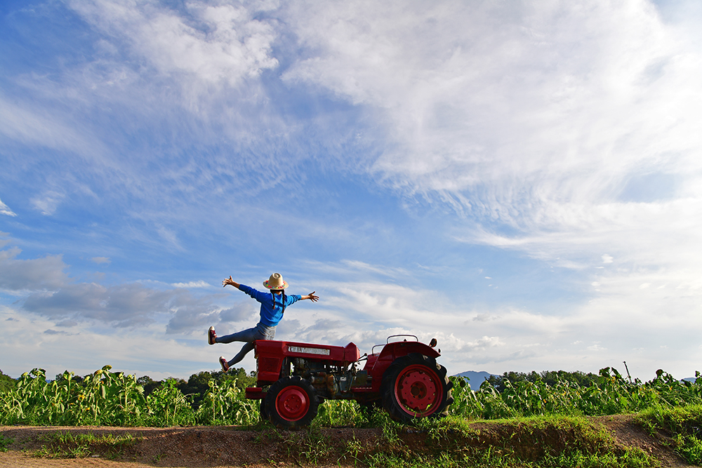파란하늘과 붉은 경운기가 잘 어울립니다. 경운기에 오른 전속모델께서 재밌는 포즈를 잡아줍니다. 독특한 포즈는 '하늘에서 뚝 떨어지는 모습' 같은데요, 어디서 비명소리가 들리는 듯도 합니다. ㅎㅎ