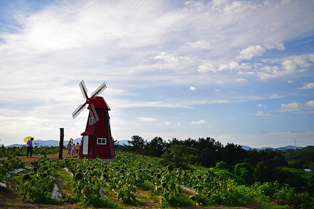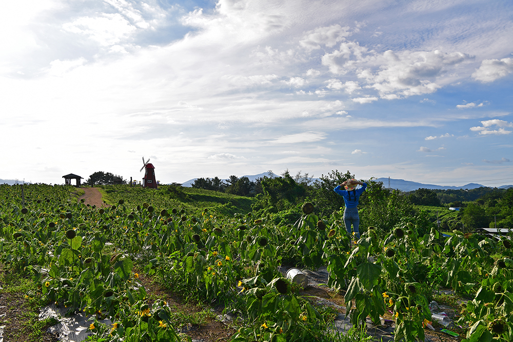 혹시나 했지만 역시나 였습니다. 축제장의 해바라기는 대부분 고개를 숙이고 있습니다. 아쉬운 마음이 컸지만, 어쩔수 없지요... 그래도 축제장 분위기는 즐겨봐야 하지않겠습니까? 그래서 해바라기 군락지를 둘러보기로 하고, 멀리 있는 풍차까지 갔다 걸어보기로 했습니다.