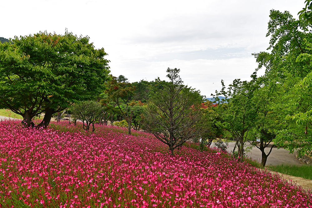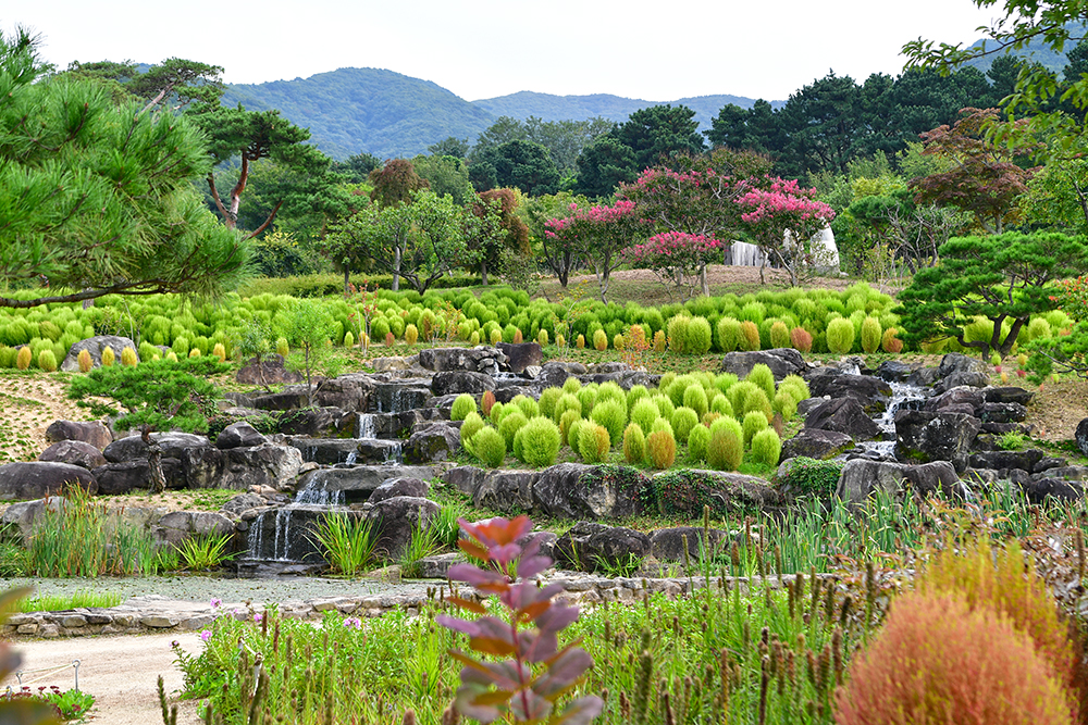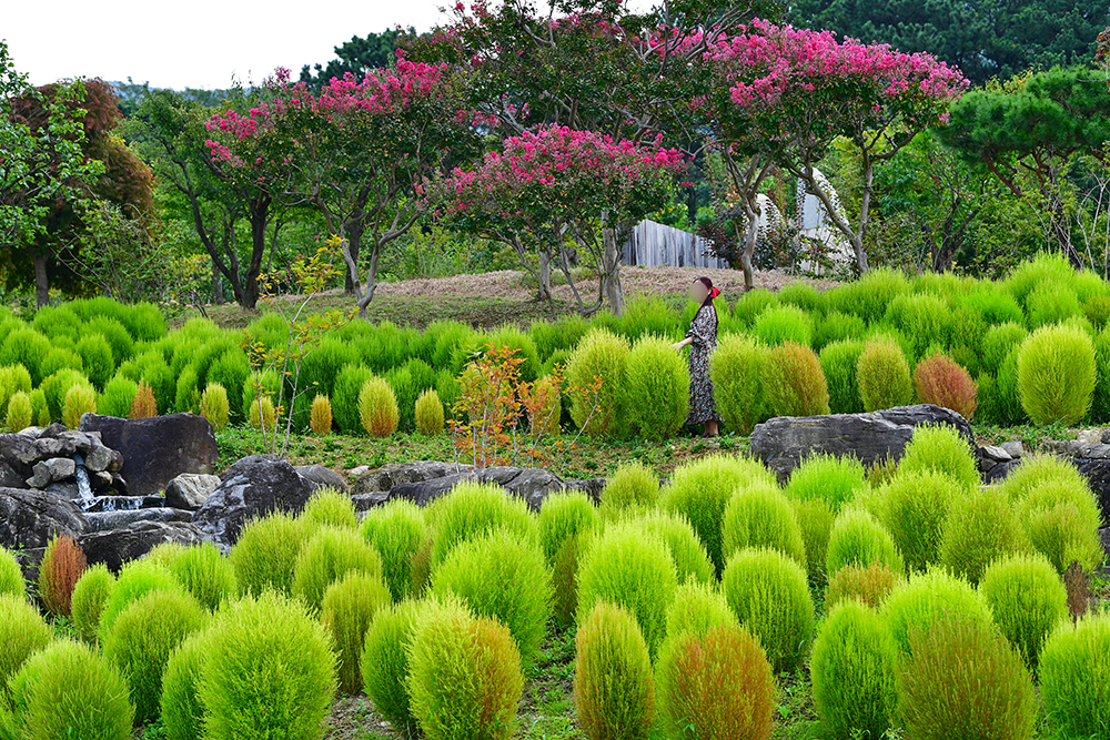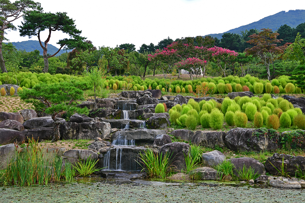 가우라꽃을 지난 댑싸리 군락지에 도착했습니다. 군락지 앞에 작은 연못이 있습니다. 특히 작은 폭포와 어우러진 모습이 너무도 아름답습니다. 게다가 붉은 배롱나무는 한폭의 동양화를 연상케합니다.
