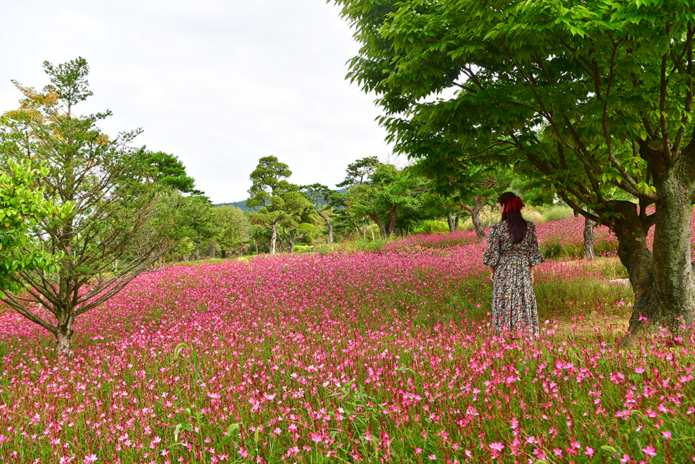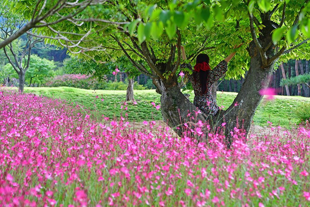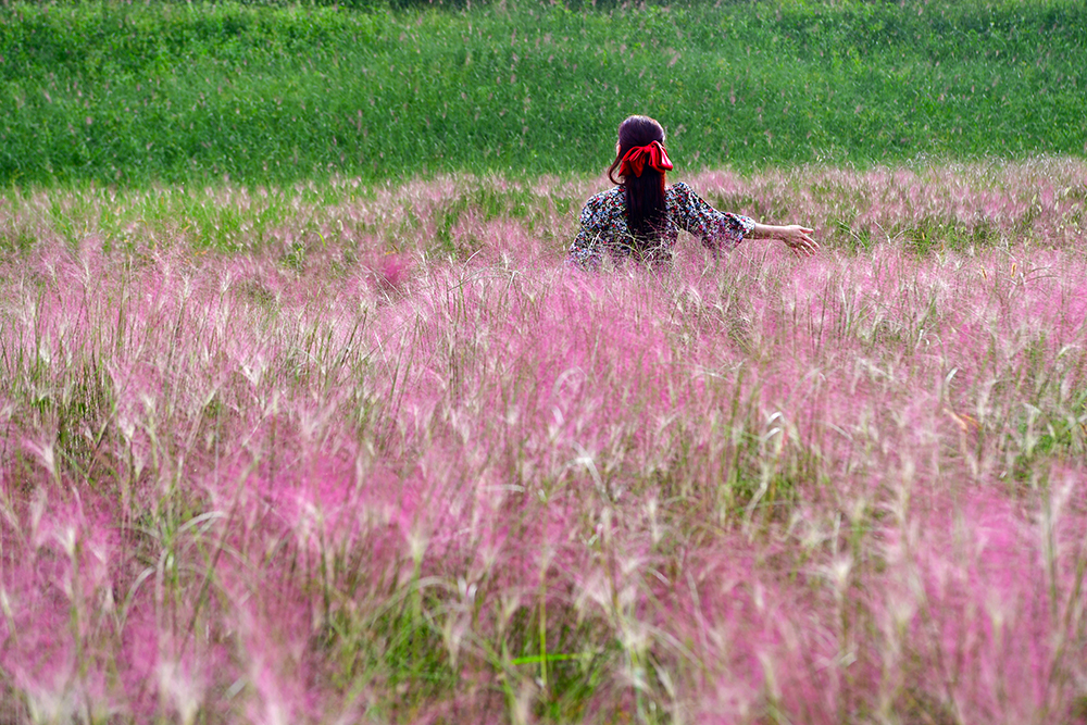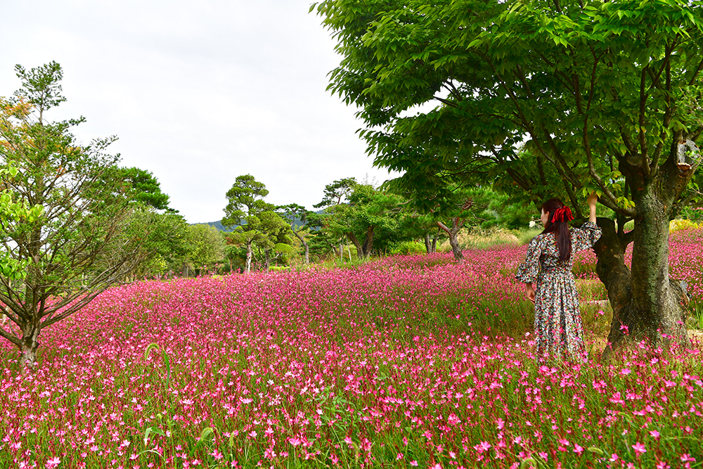 이제 댑싸리 군락지로 이동할 요량입니다. 가는 길 중간에 분홍빛 가우라 군락지가 나타납니다. 그 모습이 너무 아름답습니다. 당연히 그냥 지나칠수 없습니다. 그래서 전속모델을 바로 출동시켰습니다. ㅎㅎ