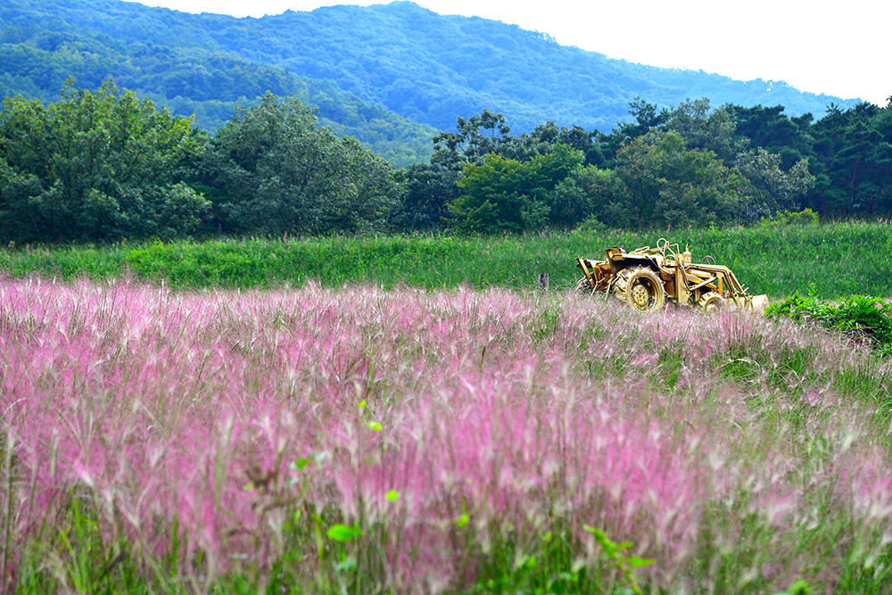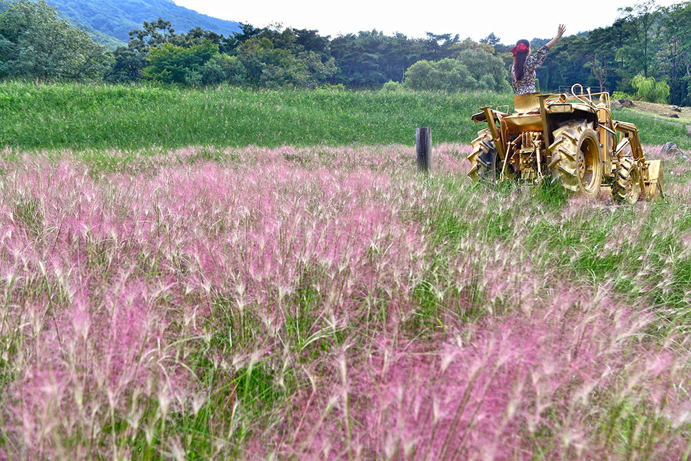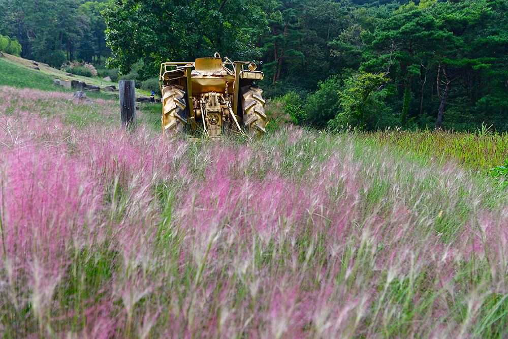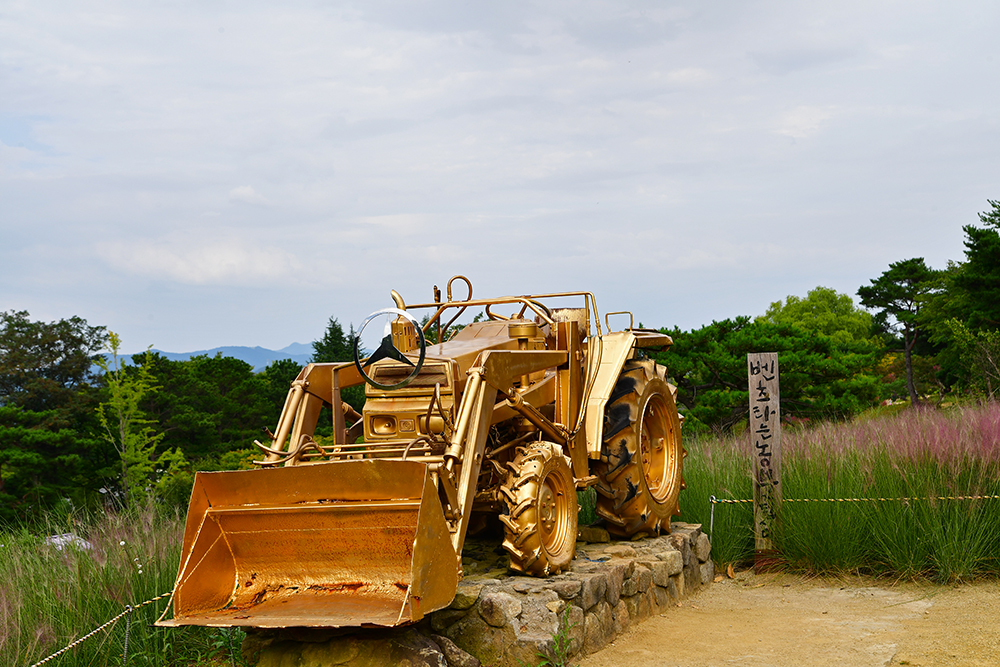 핑크뮬리 군락지 한 가운데에 황금빛 트랙터처럼 보이는 조형물이 있습니다. '벤츠타는 농부가 됩시다!' 나무 팻말의 글이 너무 재밌습니다.