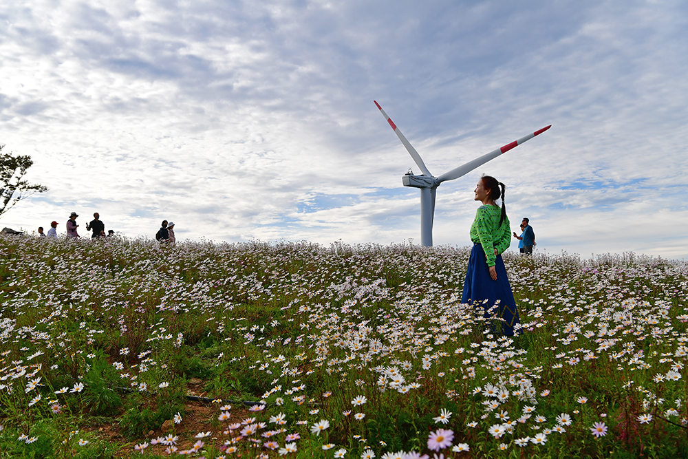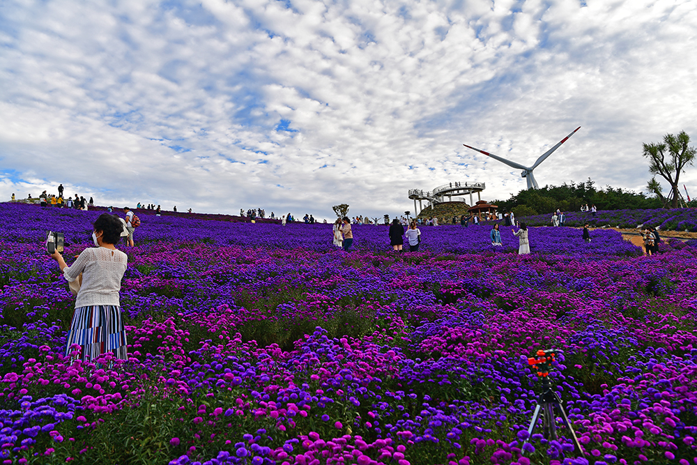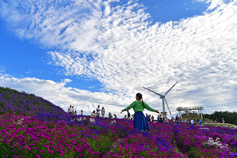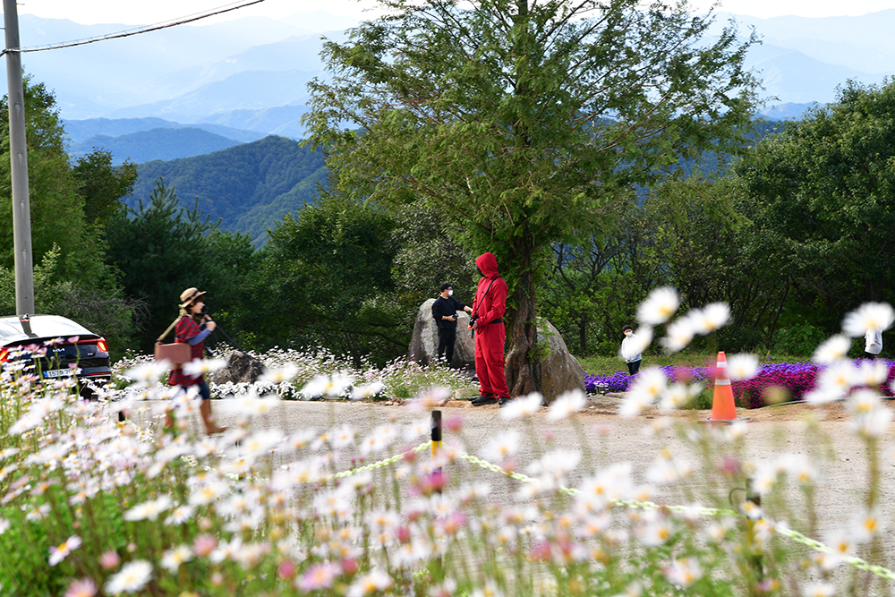 구절초 군락지로 발걸음을 옮겼습니다. 하얀 구절초와 하얀 구름이 예쁜 조화를 이룹니다. 게다가 풍력발전기는 이곳만의 독특한 분위기를 연출합니다.ㅎ 그런데... 어느 순간 붉은 옷을 입은 분이 갑자기 나타납니다. 바로.. '오징어게임'의 진행요원( 조교? ) 입니다...ㅋ