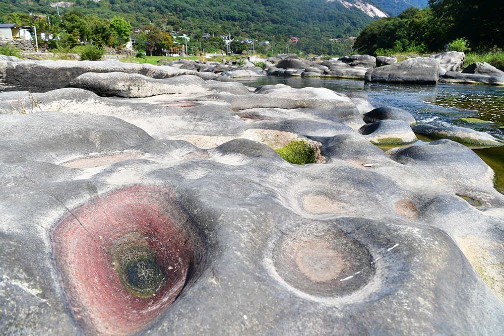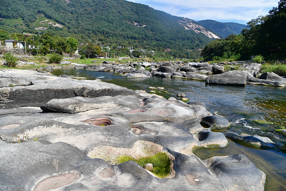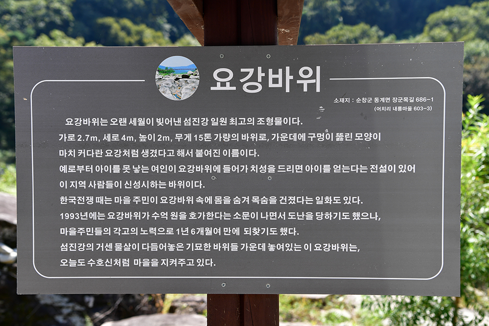 바위 속으로 들어가기 위해 강가로 내려 가려는데 '요강바위' 안내판이 있습니다. '오랜 세월이 빚어낸 섬진강 최고의 조형물'이란 문구에 눈길이 멈춥니다. 안내문을 읽어보니 신비롭다는 생각이 들어서, 요강바위를 찾아서 천천히 살펴봤습니다. 큰 바위에 커다란 구멍에 뚤려있는 있는 모습이 확실히 독특하고 특이합니다. ㅎ