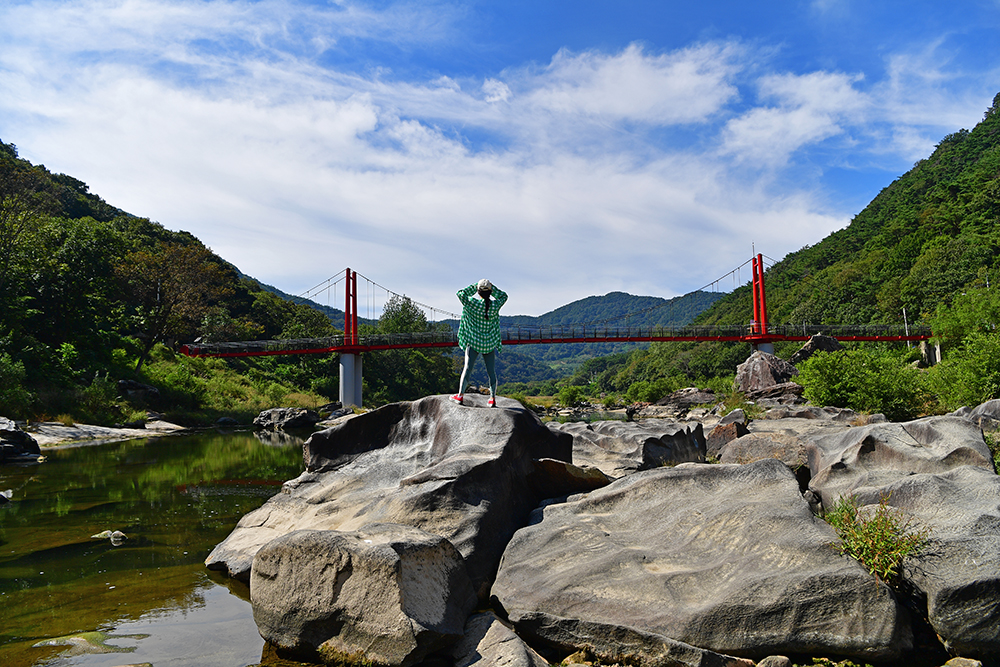 장군목의 멋진 바위 위에서 현수교를 배경으로 전속모델의 모습을 담아봅니다. 파란 하늘과 흰 구름이 찬조 출연하여 예쁜 분위기를 연출해 주네요~ ㅎㅎ