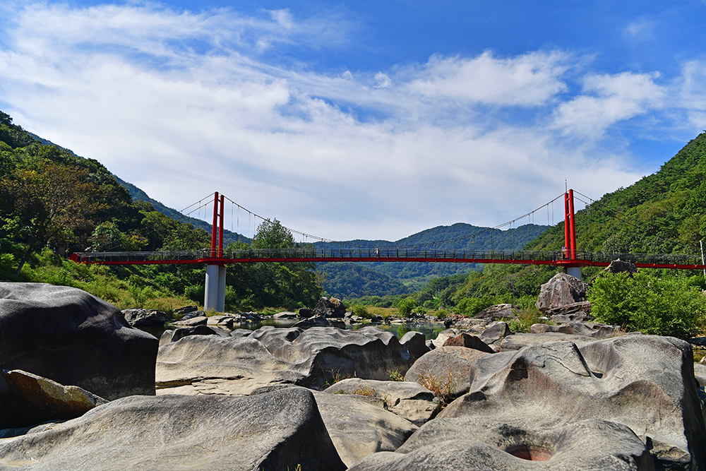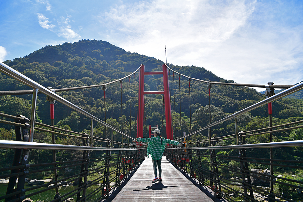 순창 용궐산 하늘길에서 보니 산 아래 보이는 붉은 현수교가 멋져 보입니다. 주변 바위와 어우러진 모습이 독특했는데요, 등산로 입구에서 멀지 않은 곳이라 현수교를 찾았습니다.