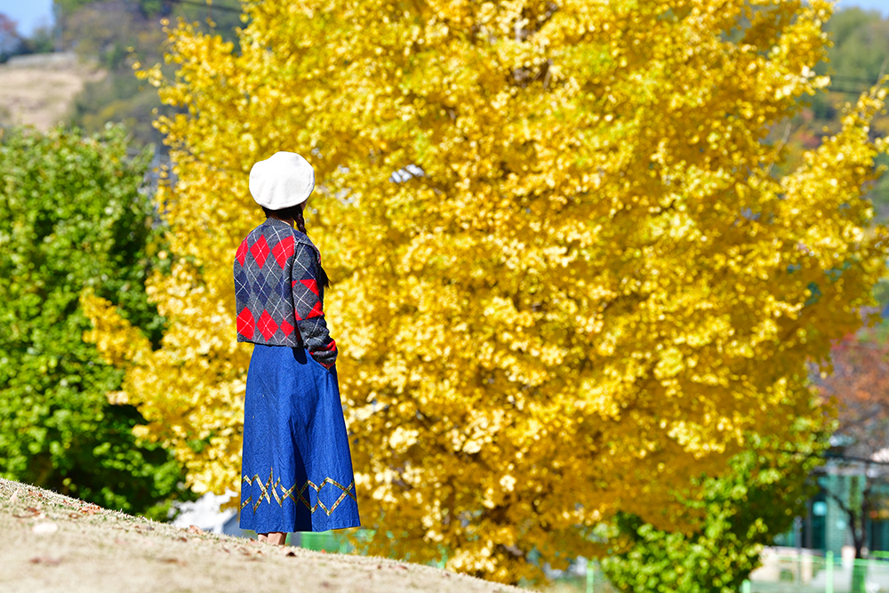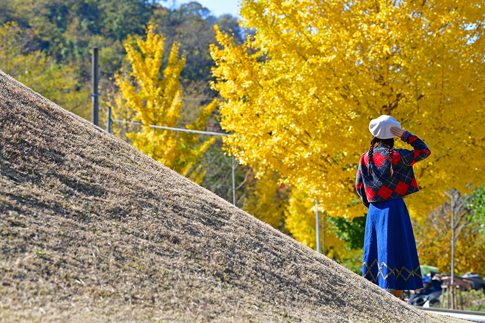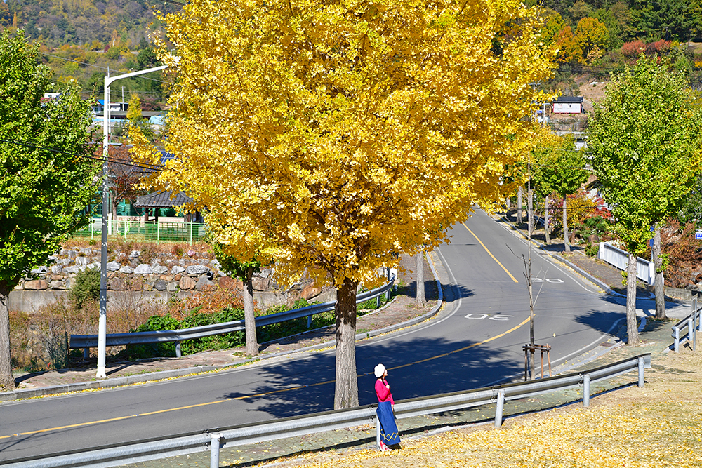 석빙고 옆에서 유독 노란빛을 뽐내는 큰 은행나무가 있습니다. 실제는 도로변에 위치하고 있는데, 규모가 있는 탓에 마치 봉분 옆에 있는 것 같습니다. 그래서 노란 은행나무를 배경으로 전속모델의 모습을 담아봅니다. ㅎㅎ