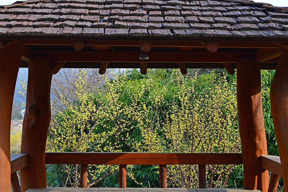 농로(?)처럼 만들어진 산책로에 들어서면 제일 먼저 정자가 눈에 띕니다. 산수유가 정자에 어우러진 모습이 참 좋습니다.