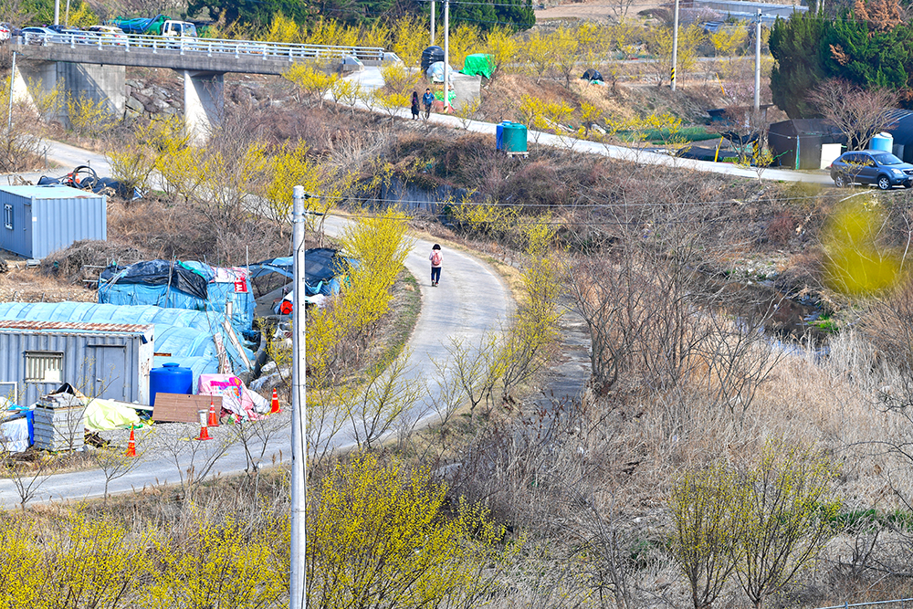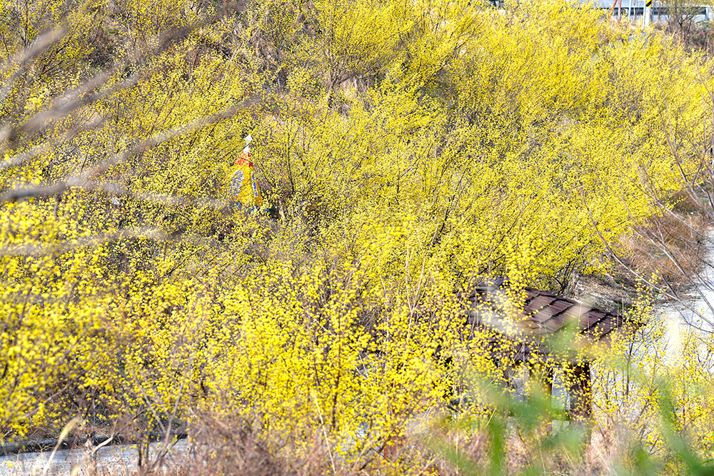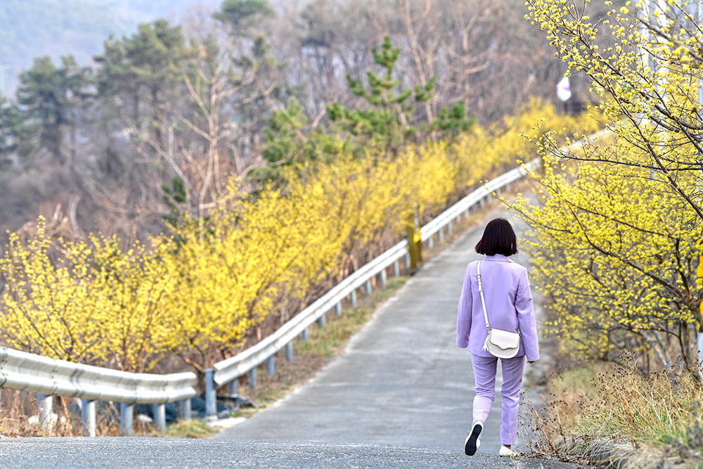 정자를 지나 윗쪽으로 방향을 잡습니다. 이어지는 길을 따라 노란 산책을 즐겨 봅니다. 한적하게 지나가는 여인의 모습에서 노란 봄기운을 느껴봅니다. ㅎ