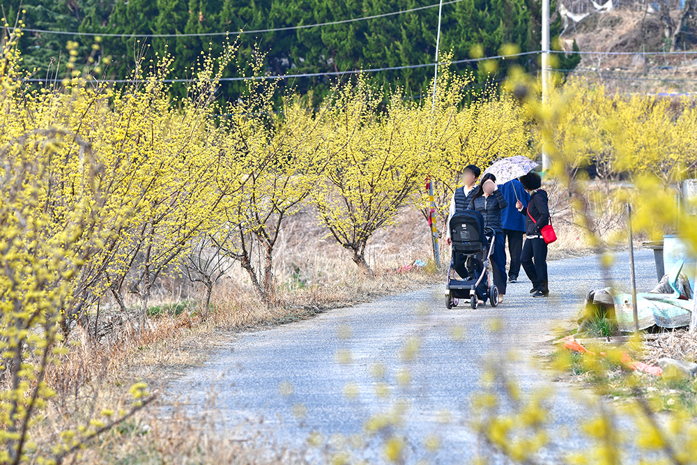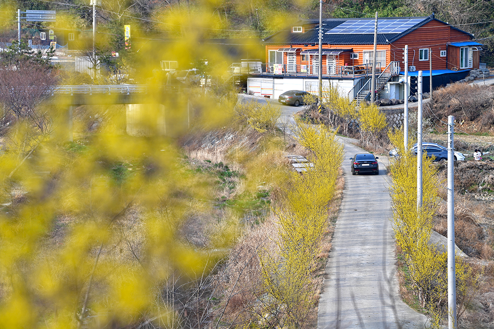 마을 입구 버스정류장 옆에 두 세대 정도 주차할 수 있는 공간이 있습니다. 그 곳에 주차한 후 마을로 들어서니 노란 산수유가 활짝 반겨줍니다. 여기가 제가 제일 좋아하는 포인터입니다. 그곳에서 산수유가 연출하는 노란 봄을 담아 봅니다. ㅎㅎ