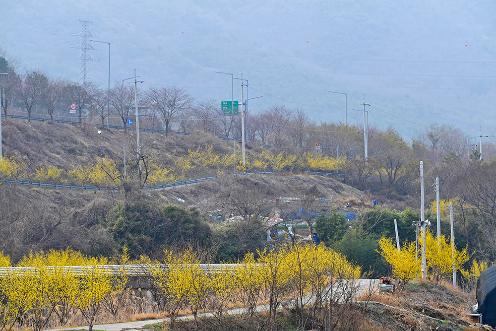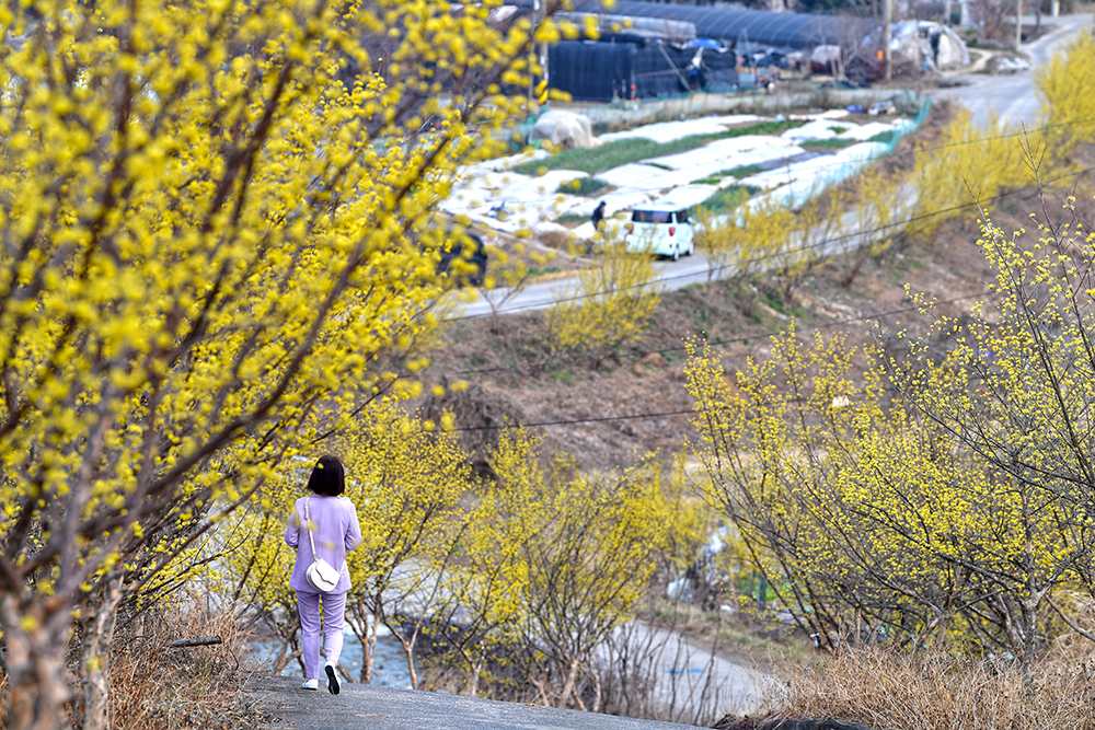 산책로 끝에 다다르면 우산천 둑방에 이릅니다. 하천을 따라 이어지는 둑방 위에도 산수유 나무를 심었습니다. 키가 조금 작은 것이 아쉽지만, 활짝핀 산수유의 아름다움은 여전합니다.