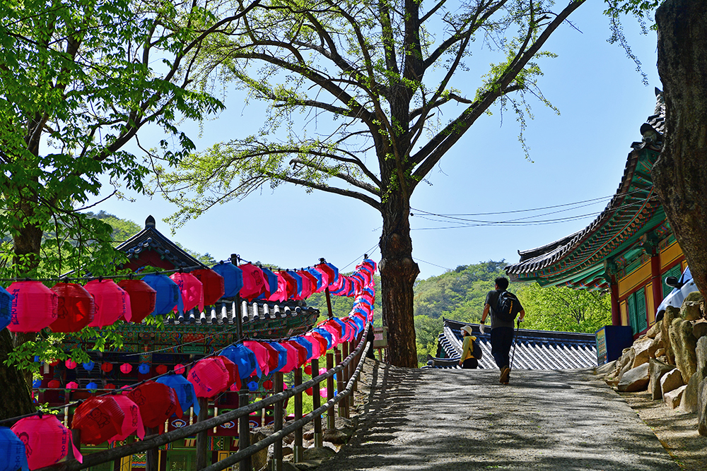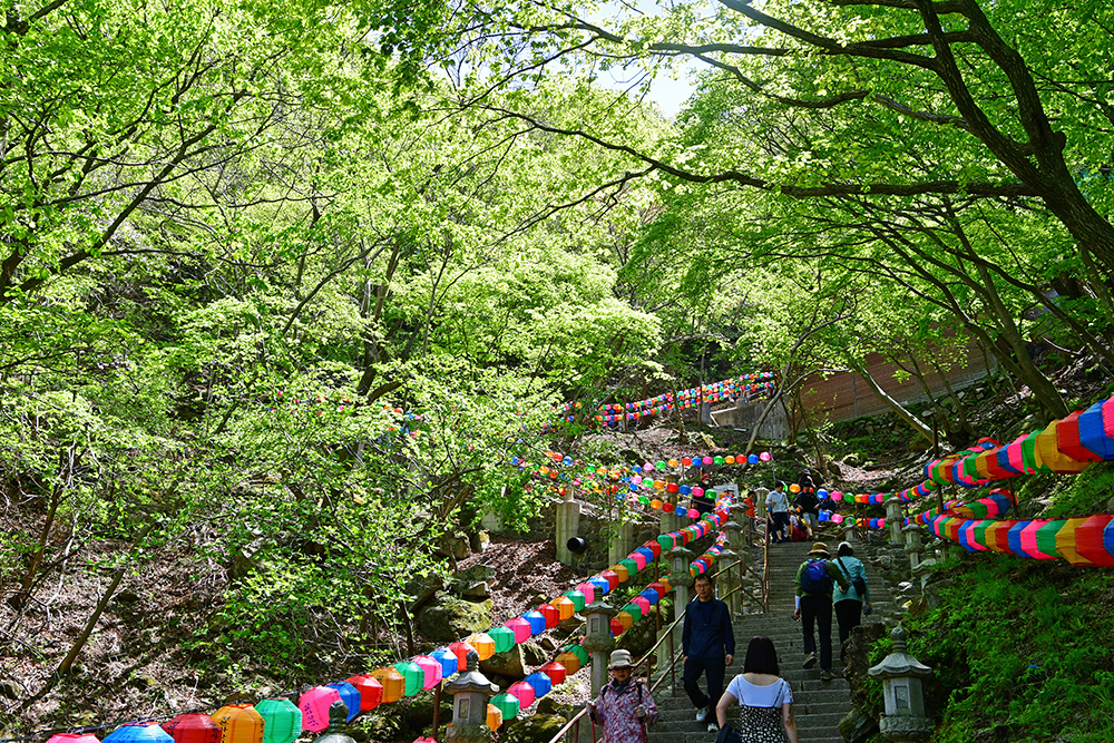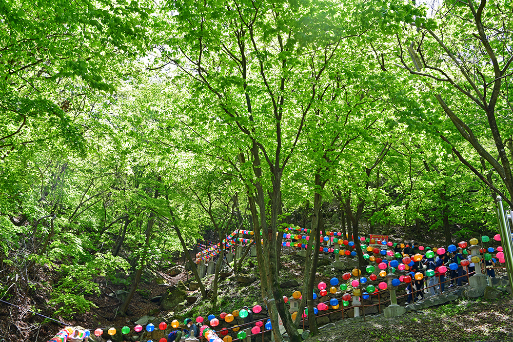 일주문을 지나면 작은 주차장이 나타납니다. 여기서 왼쪽은 '갓바위', 오른쪽은 '선본사'가 있습니다. 갓바위 부처님을 먼저 뵙기 위해 왼쪽으로 방향을 잡습니다. 울창한 숲길을 따라 걸려 있는 연등이 참 아름답습니다. 그 모습을 보면서 발걸음을 옮겨 봅니다. ㅎ