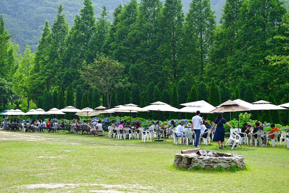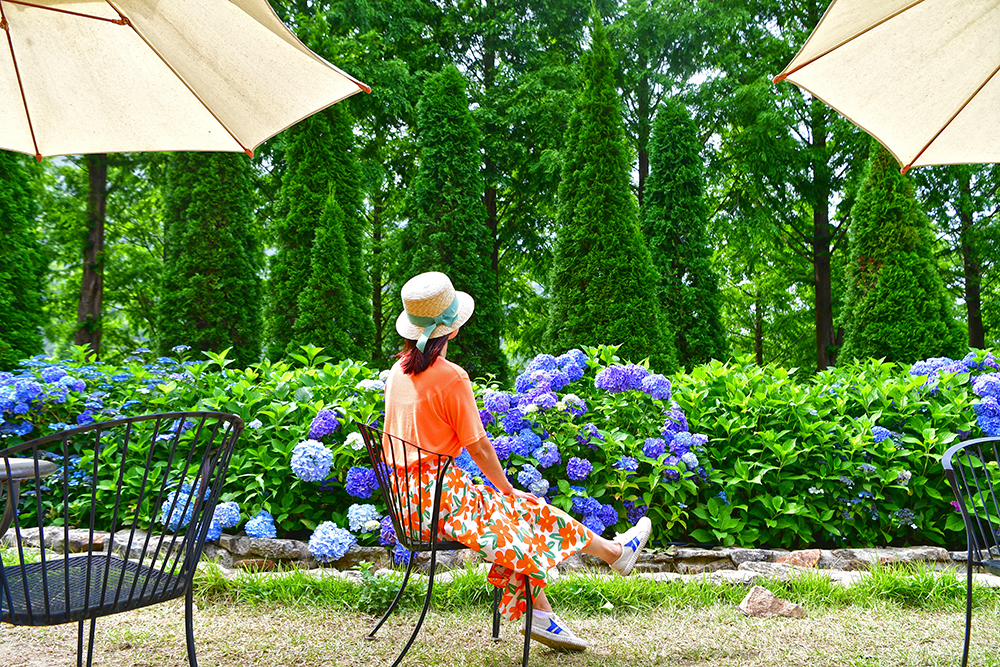 수국 정원을 지나면 잔디광장이 나타납니다. 활짝 핀 수국을 따라 곳곳에 파라솔이 있습니다. 야외 카페도 있어, 시원한 음료를 마시며 잠시 쉬어가기 좋습니다. 여기서 수국과 함께 잠시 망중한을 즐겨봅니다.~