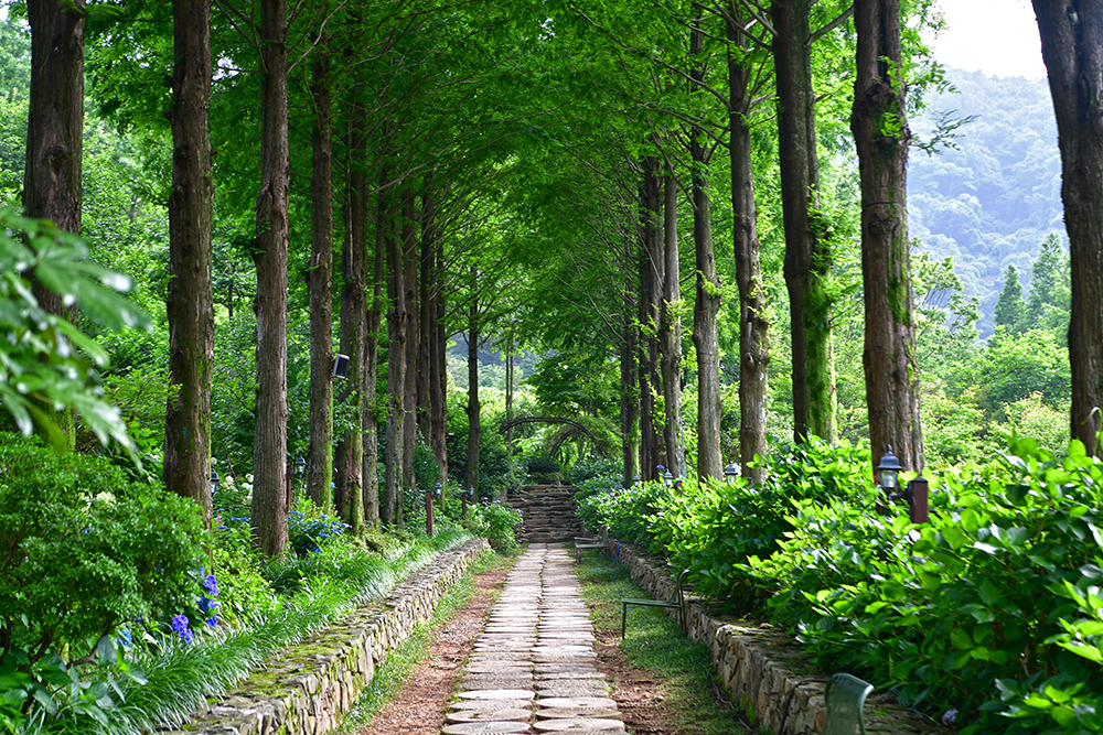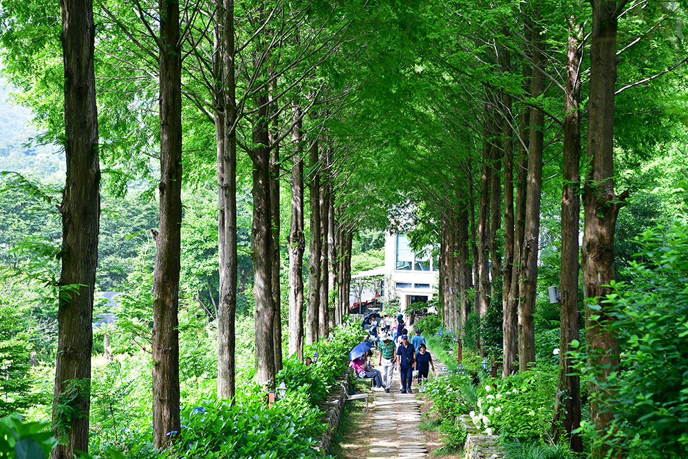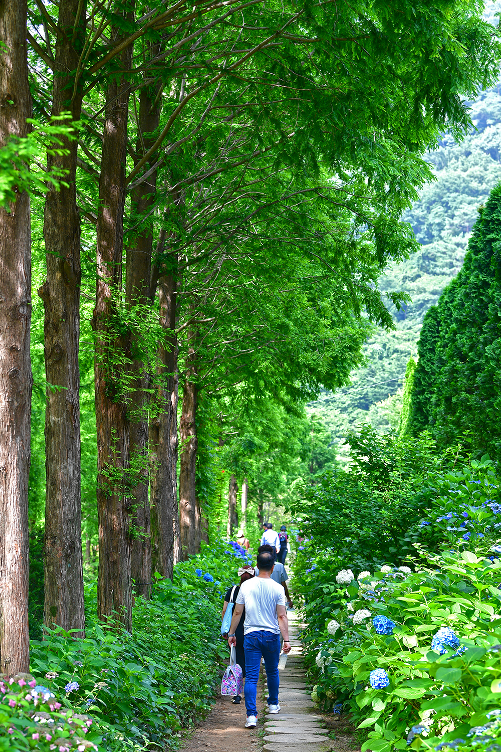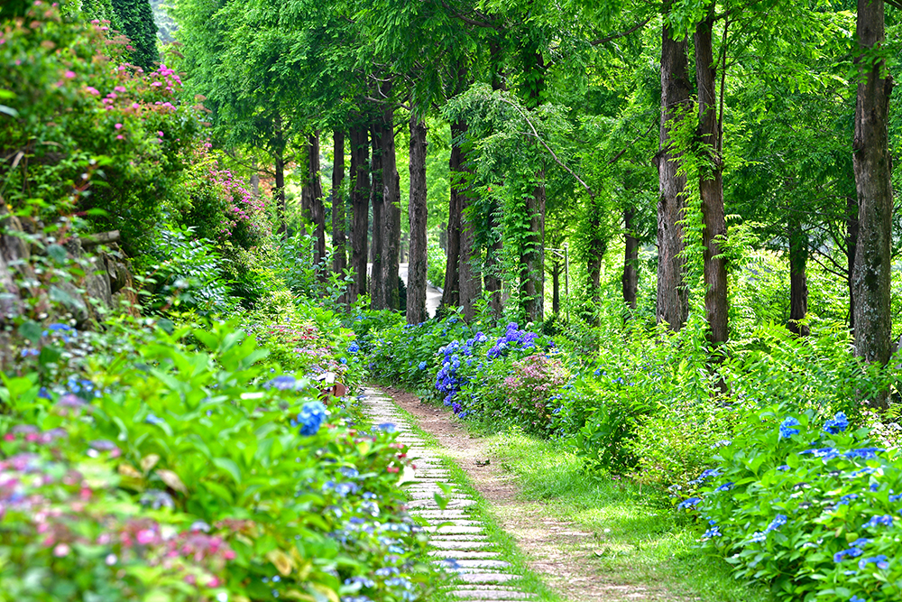 이어서 메타세콰이어 1길에 들어섰습니다. 앞서 소개했던 잔디광장 옆에 있습니다. 메타세콰이어 2길보다 수국이 더 많이 피었습니다. 그 길을 거닐며 수국과 메타세콰이어의 기운을 즐겨봅니다. ㅎ