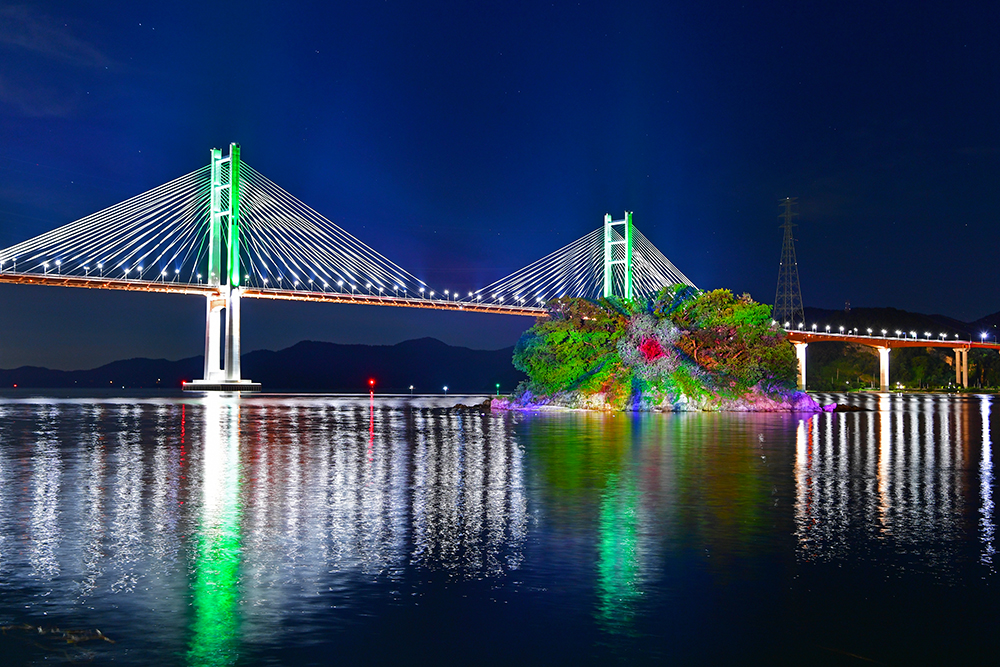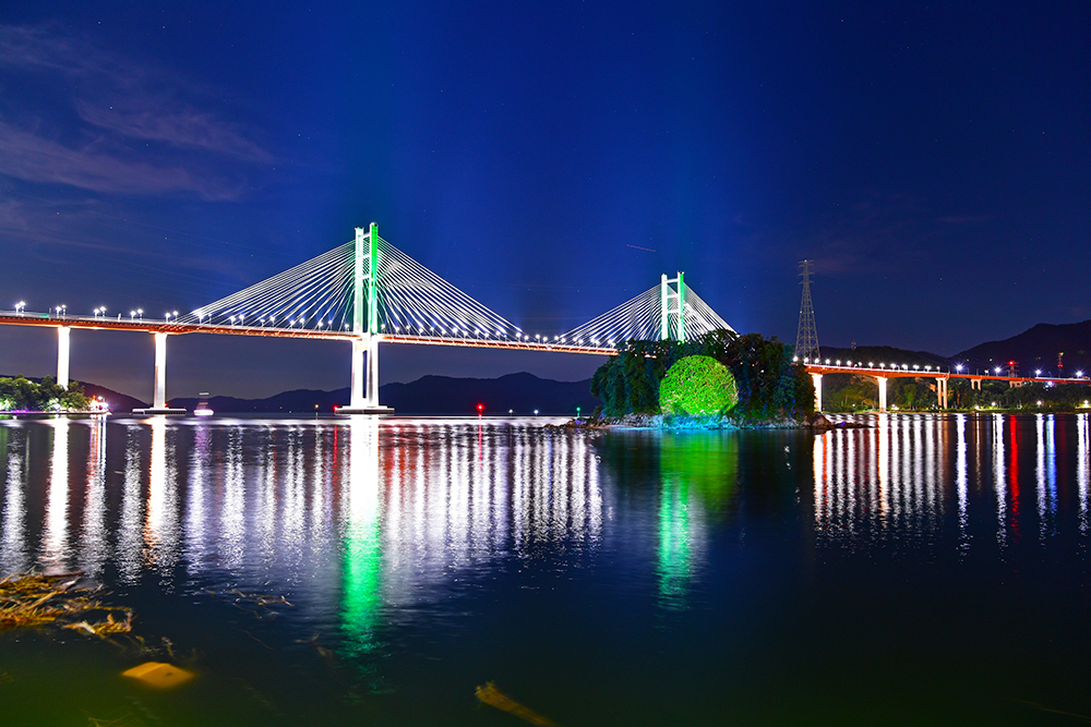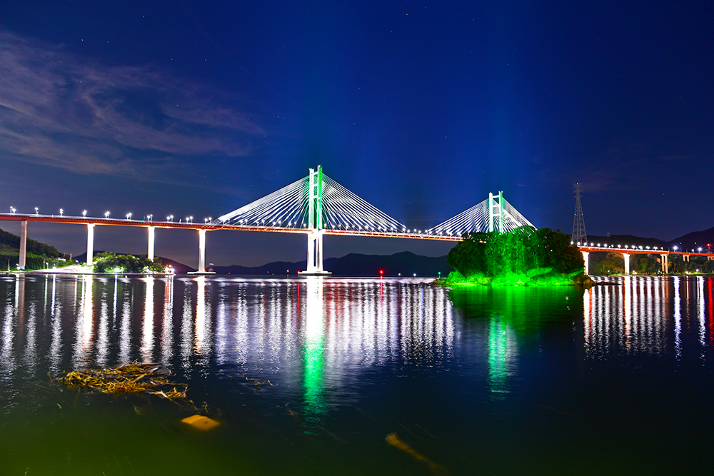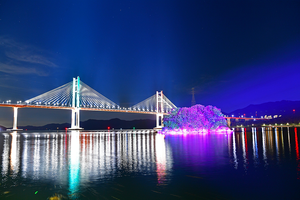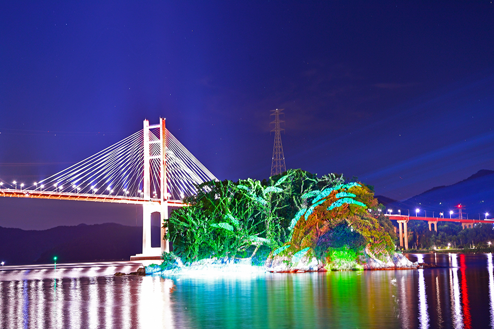 삼귀해안도로를 따라 귀산카페거리를 걷는데 어디선가 공연 소리가 들려 옵니다. 자세히 살펴보니 마창대교 아래에 있는 '개구리섬'을 배경으로 미디어아트(?)가 펼쳐집니다. 작은 섬을 무대삼아 펼쳐지는 미디어 쇼가 흥미롭습니다. 이런건 영상으로 담아야 하는데, 사진으로 담는 것이 못내 아쉽네요..ㅎㅎ