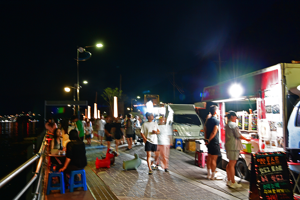 예쁜 카페가 즐비한 귀산 카페거리의 모습을 담아 봅니다. 푸드트럭에는 많은 분들로 붐빕니다. 아.. 밤낚시를 즐기는 분들이 많습니다. 많이 잡으셨나 모르겠습니다. 더위를 피해 밤 바다의 낭만을 즐기려는 많은 분들이 참 보기 좋습니다. ㅎ