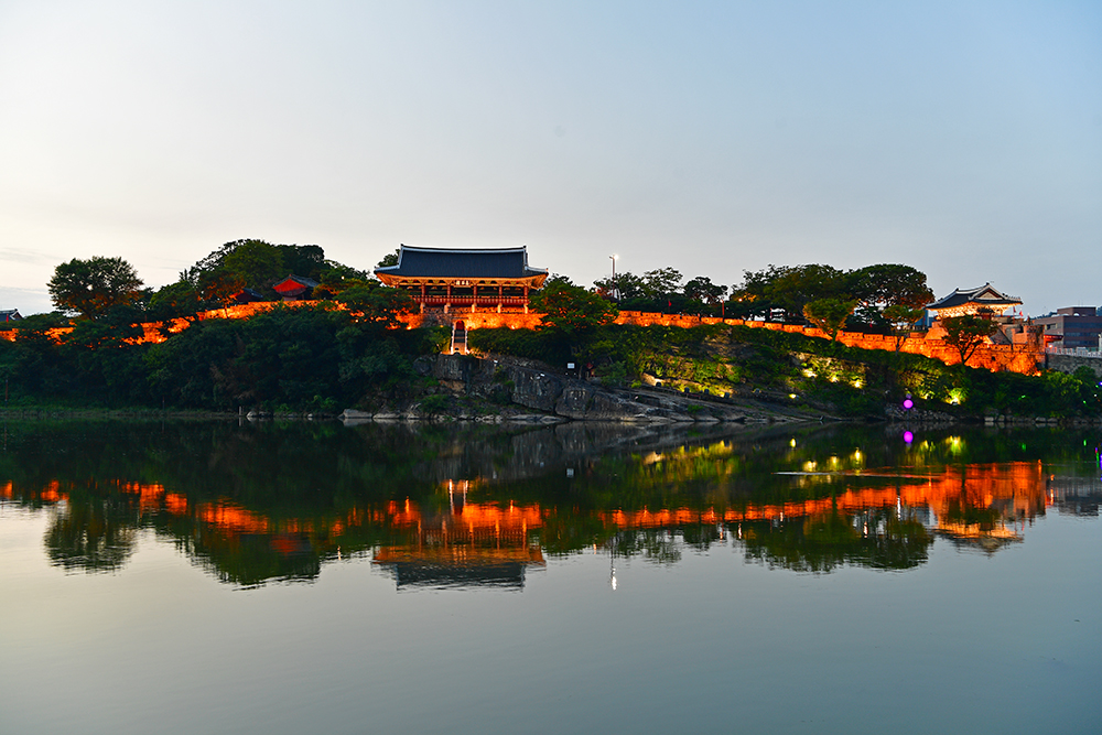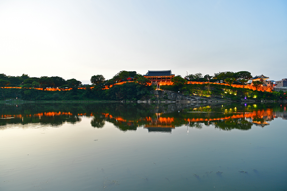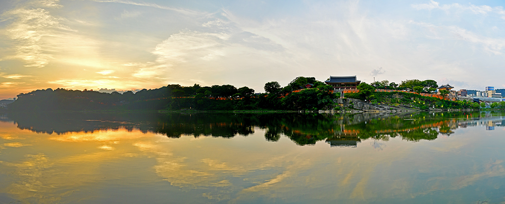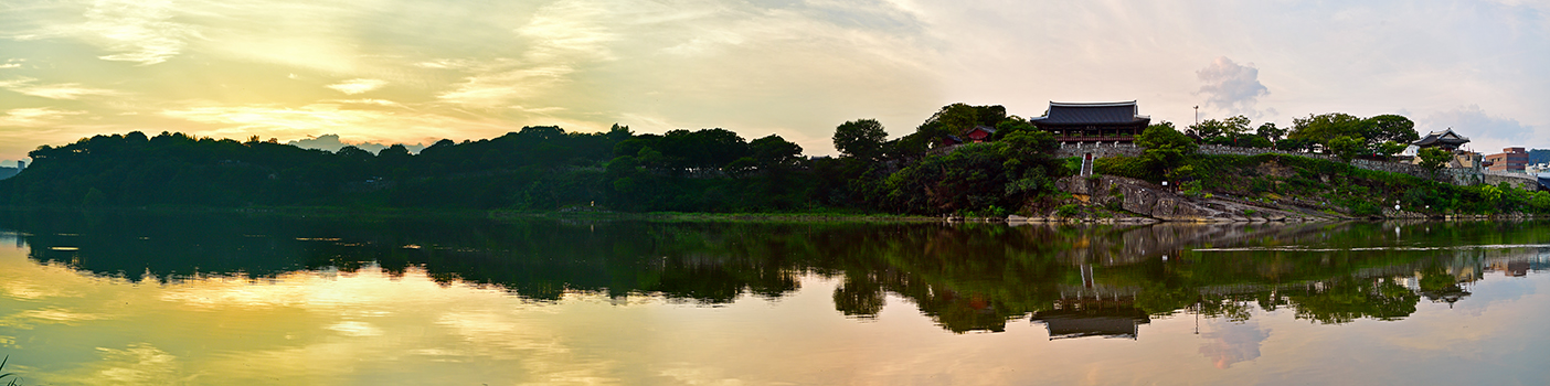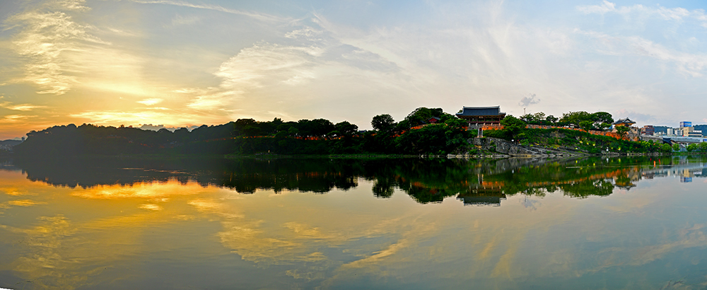 촉석루와 진주성 일대 모습을 파노라마로 담아 봅니다. 노을질 무렵의 조명 불빛이 매우 아름답습니다. ㅎ