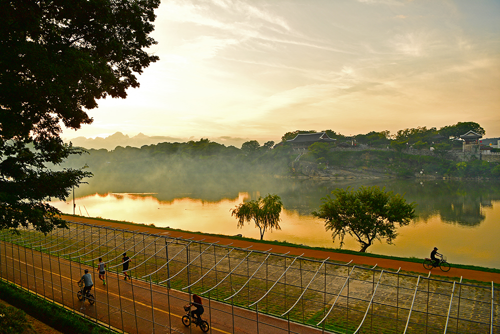 제가 찾은 곳은 진주 남가람공원의 중앙광장휴게소입니다. 촉석루를 정면으로 마주볼 수 있는 곳입니다. 도로변에 주차장이 있어 편리합니다. 남강 변으로 내려가보니 곧 노을이 시작될 듯 합니다.