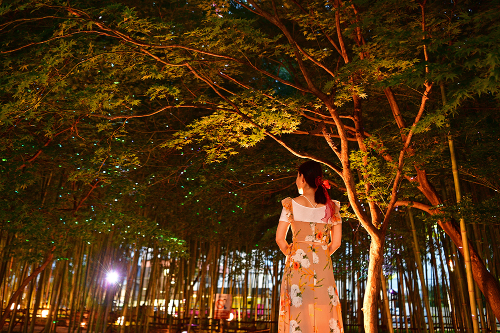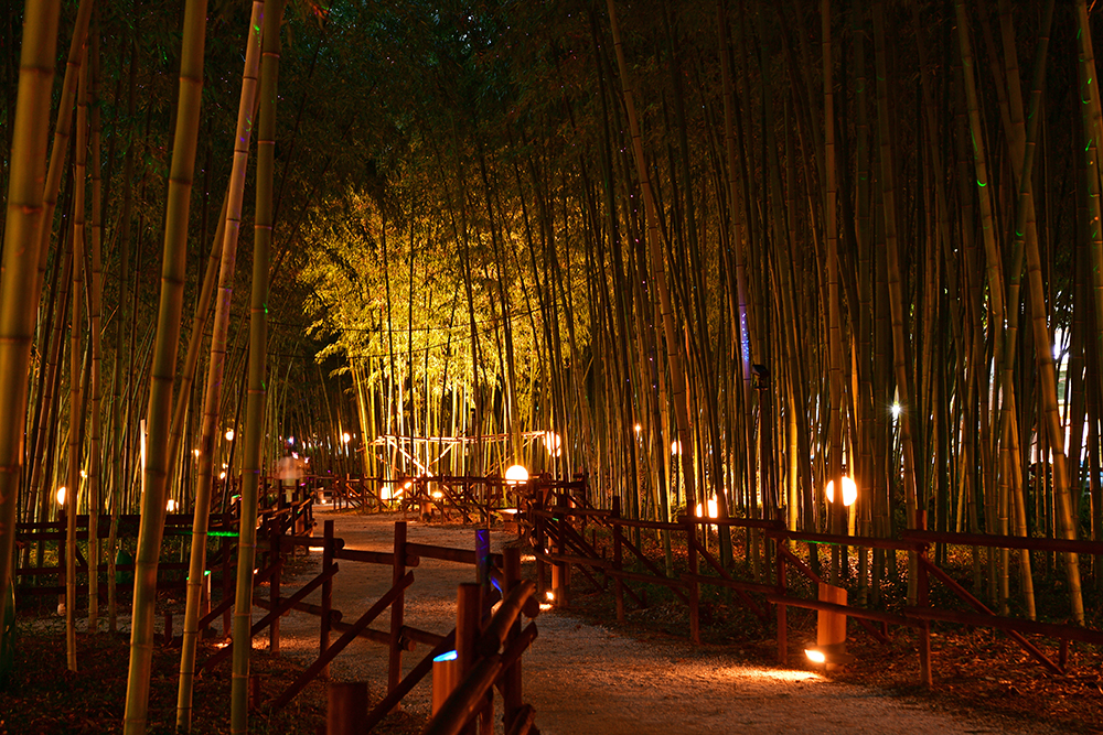 진주 중앙광장휴게소 일원에서 멋드러진 진주성 촉석루의 야경을 즐겼습니다. 귀가를 준비하려는데, 예쁜 조명이 반짝이는 대나무 숲이 보입니다. 그 모습에 호기심이 발동하여 휴게소 옆에 있는 대나무 숲을 둘러보기로 했습니다.