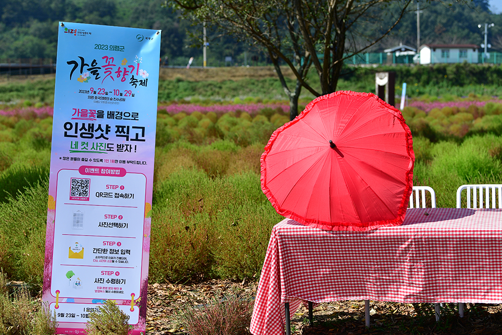 드넓은 호국의병의 숲 곳곳에 '2023 의령군 가을꽃향기 축제' 를 알리는 배너가 있습니다. 사진을 찍으면 네컷 사진으로 인화를 해주나 봅니다. 저도 해볼걸 그랬습니다. ㅎㅎㅎ