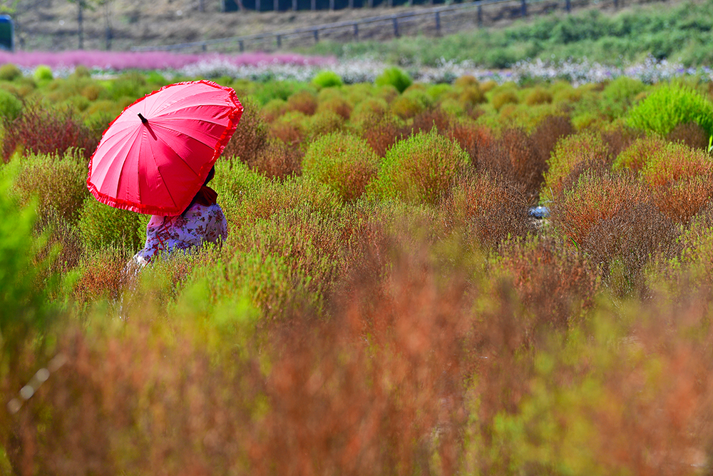 댑싸리의 작황을 살펴봤습니다. 아직은 파릇파릇하지만, 분홍 빛으로 서서히 물들고 있습니다. 활짝핀 가우라 꽃과 핑크뮬리 때문인지 오히려 덜 물든 댑싸리 모습이 보기 좋습니다. 댑싸리와 함께 어우러진 사람들의 모습을 함께 담아 봅니다. ㅎ