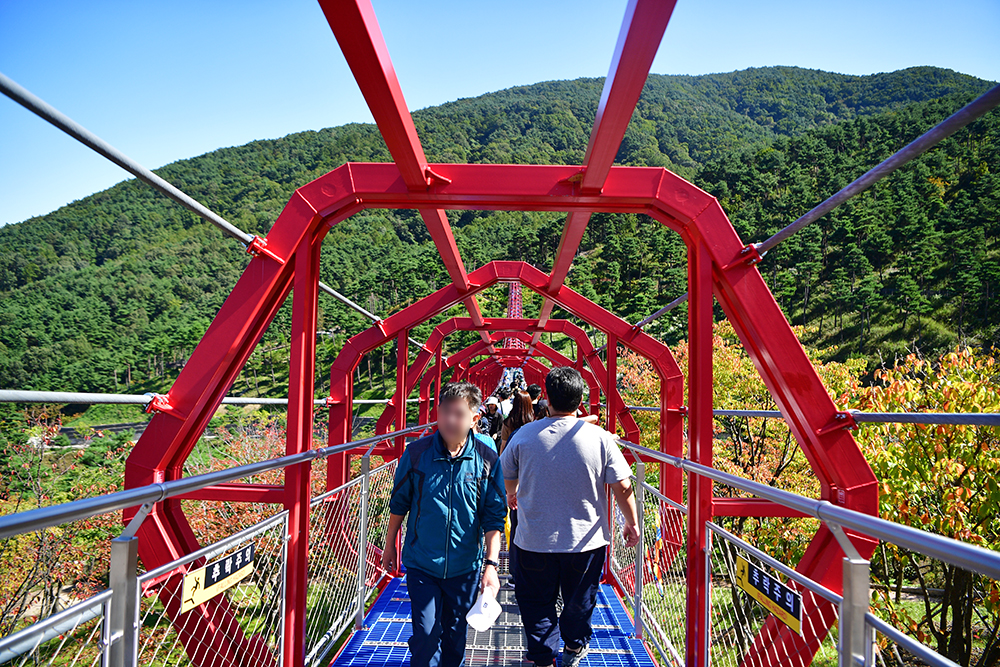 무릉교를 건너 봅니다. 많은 방문객 탓에 출렁거림은 많은 편인데, 그닥 무섭지 않습니다. 제가 고소공포증이 좀 있는 편인데 좀 놀라웠습니다. 육각형 터널 구조 탓인지 아니면 진짜로 좋은 기가 통해서 그런 건지 모르겠지만, 그저 신기할 따름 입니다. ㅎㅎ