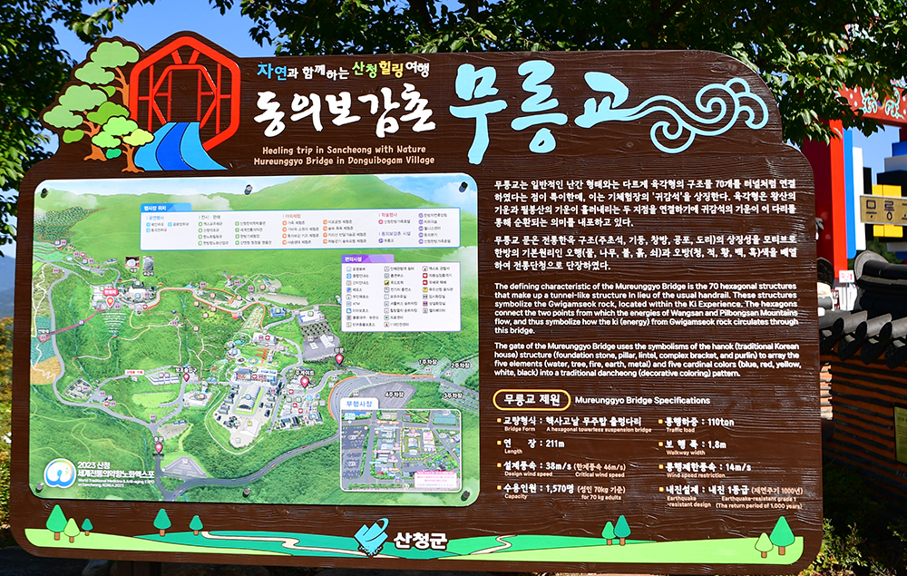 귀감석에서 좋은 기운을 받았습니다. 이어서 올해 생겼다는 무릉교로 향합니다. 오늘의 목적지 입니다. 안내판을 보니 아주 의미있는 다리입니다. 일반적인 난간 형태와 달리, 육각형의 구조물 70개를 터널처럼 연결한 것이 특이합니다. 구조물은 '귀감석'을 상징하는데, 뒷쪽에서 흘러내리는 산의 기운이 무릉교를 통해 순환된다는 의미라고 합니다. ㅎ