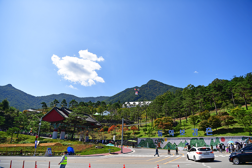 대규모 행사장 답게 주차장은 잘 마련되어 있습니다. 산청 IC 부근에는 대형 주차장을 마련하여 셔틀버스도 운행합니다. 저는 오전에 방문하여 행사장 입구의 제 4주차장을 이용했습니다. 행사장이 가까워 지자, 우뚝 솟은 조형물과 정문인 '동의문(東醫門)'이 방문객을 반겨줍니다. ㅎ