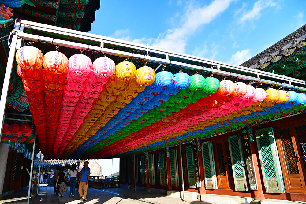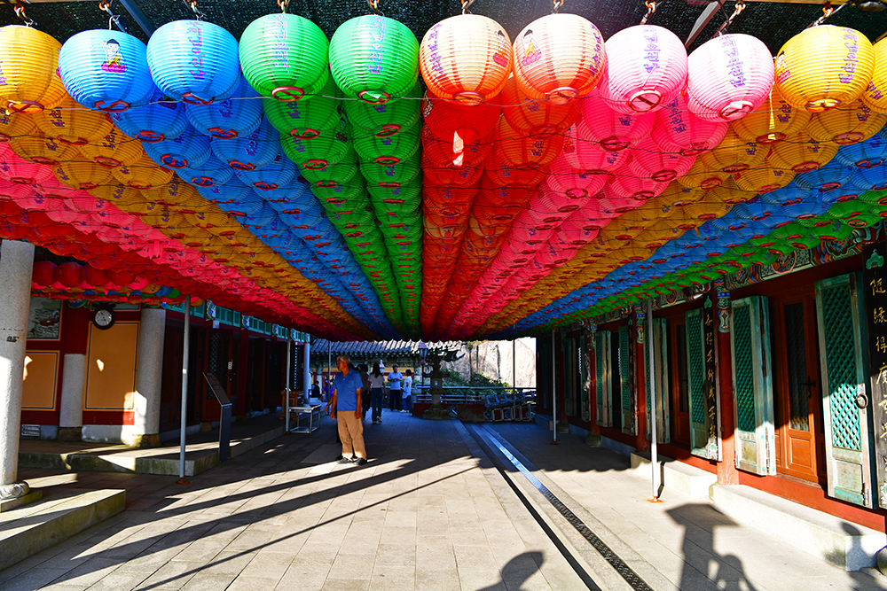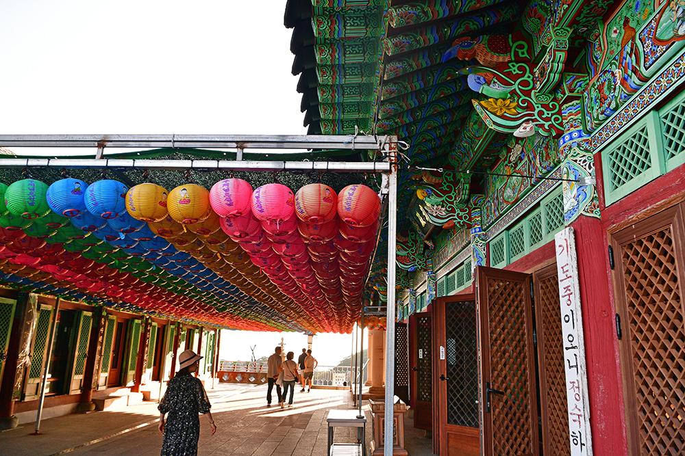 계단을 내려와 암자를 돌아가면 연등이 걸려 있습니다. 연등 행렬을 중심으로 오른쪽은 보리암의 주법당으로 대웅전 역할을 하는 보광전이고, 왼쪽은 종무소 입니다. 연등행렬이 만들어 내는 그늘 속을 걸어 봅니다. ㅎㅎ