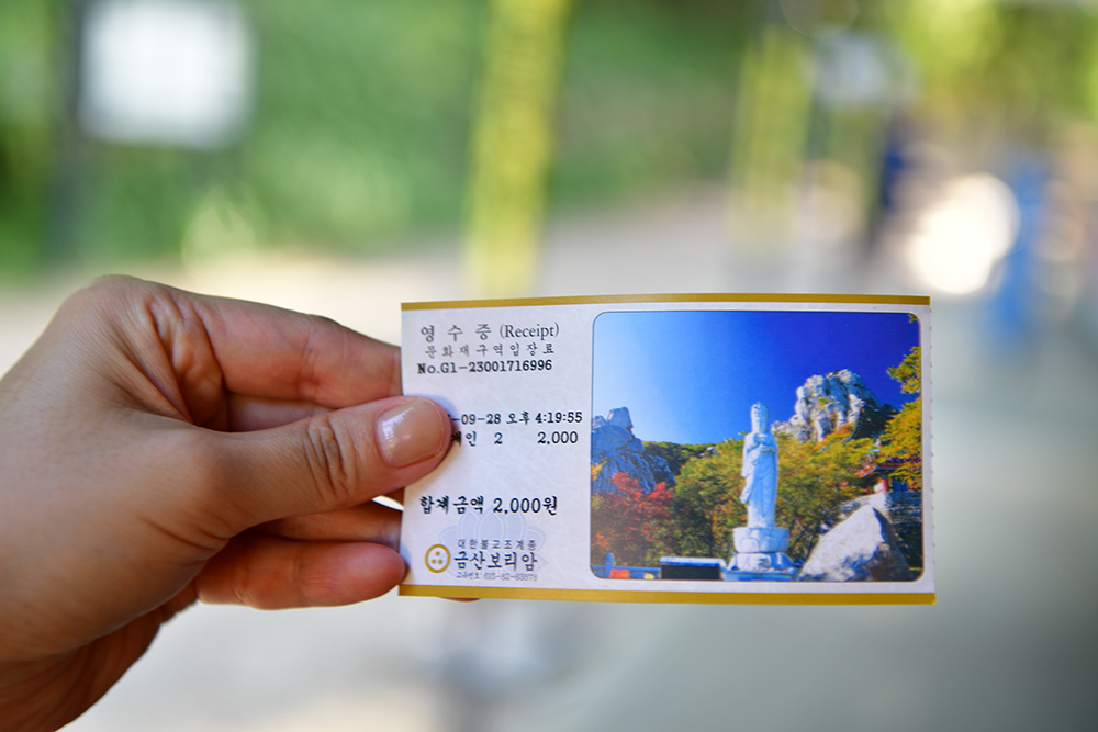 두 시간여를 달려, 오후 늦게 보리암 1 주차장( 복곡주차장)에 도착했습니다. 보통은 여기서 마을버스를 타고 매표소가 있는 제2주차장까지 이용합니다. 그런데 이 날은 늦은 오후에 찾은 탓인지, 그냥 올려 보내 줍니다. 일단 마을 버스비는 아꼈습니다. 제2주차장에 주차 후 매표소에서 입장권을 구매했습니다. 성인 1인당 1,000원의 입장료가 있습니다. ㅎ