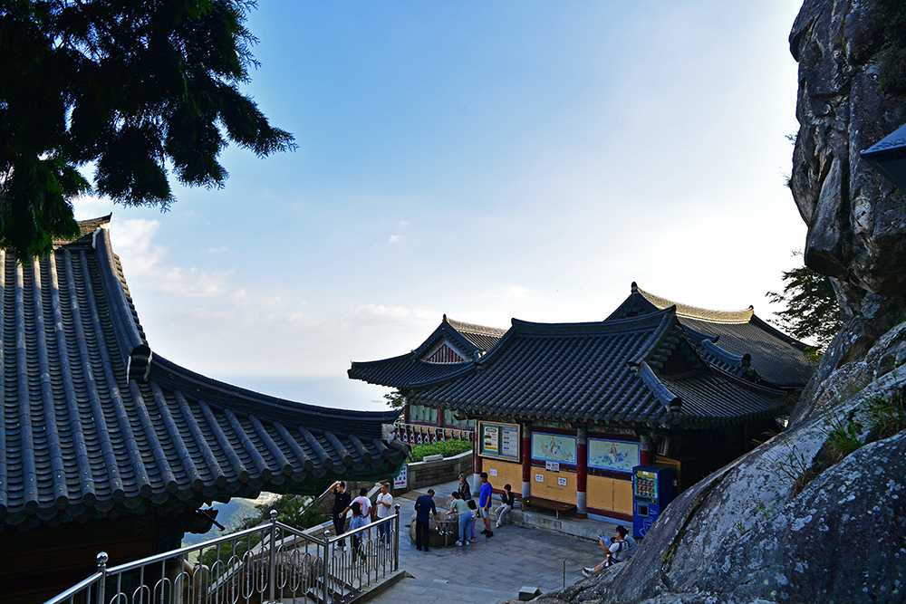바위쪽으로 암벽 위에 세워진 극락전이 보입니다. 아슬아슬한 모습이 마치 중국의 어느 절 같다는 생각도 듭니다. 극락전 처마 아래에서 바라보는 남해 바다의 모습이 정말 멋집니다. ㅎ
