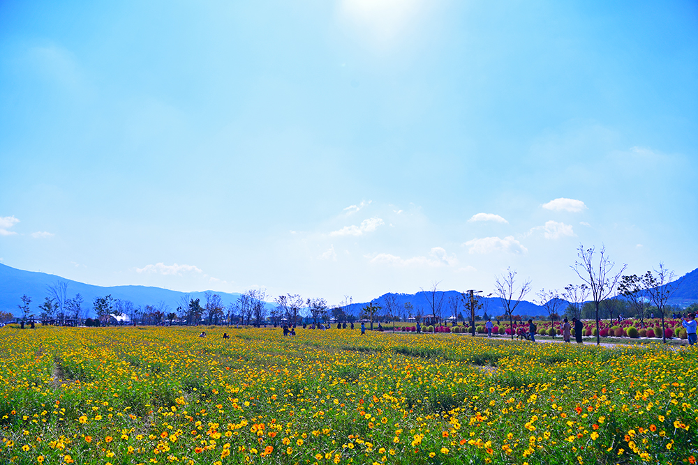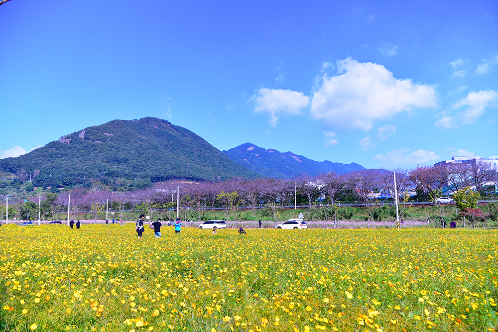은빛 갈대의 아름다움을 뒤로하고 돌아서는데.... 공원 일대를 뒤덮고 있는 노란 물결을 인상적입니다. 황화 코스모스의 물결입니다. 워낙에 넓게 조성된 규모 탓에, 황화코스모스를 즐기는 인적이ㅣ 한산해 보입니다. ㅎ