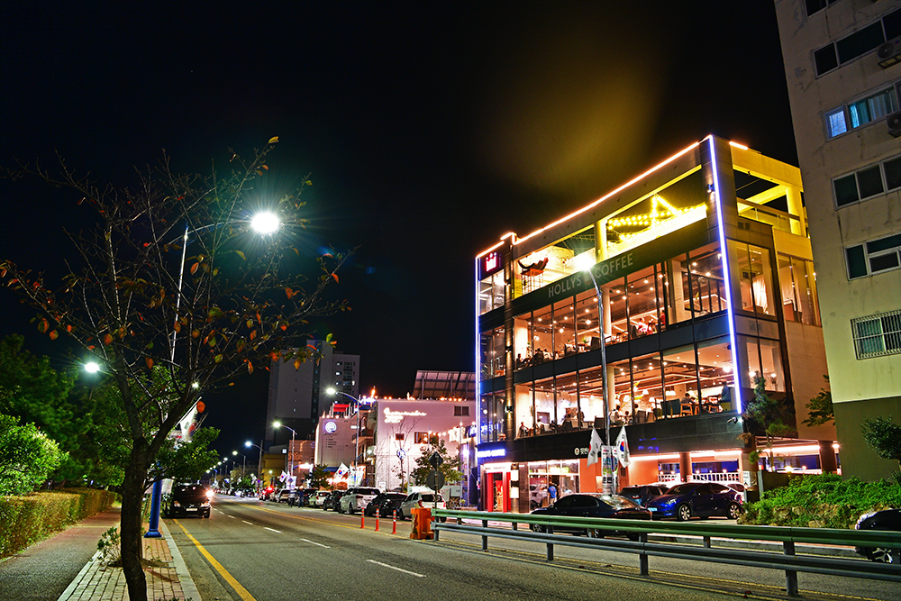 카페거리 방향의 야경을 즐겨 봅니다. 가로수와 어우러진 모습이 참 예쁩니다. 이어서 도로로 나와 카페 거리의 모습을 담아봅니다.