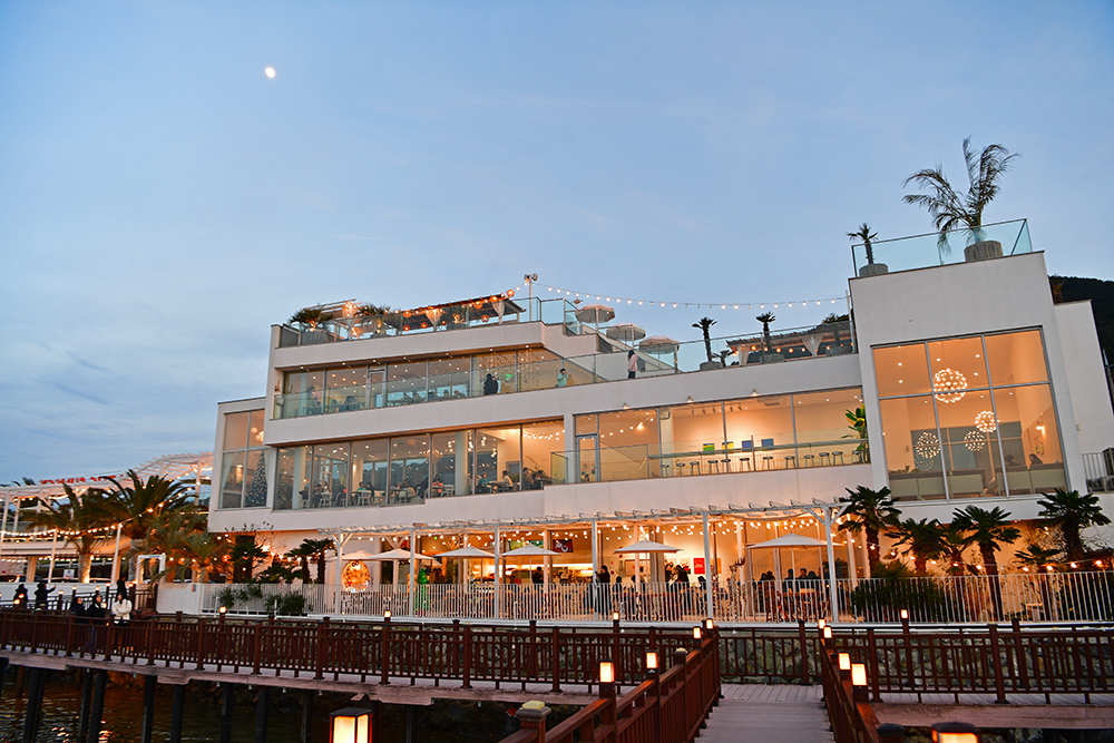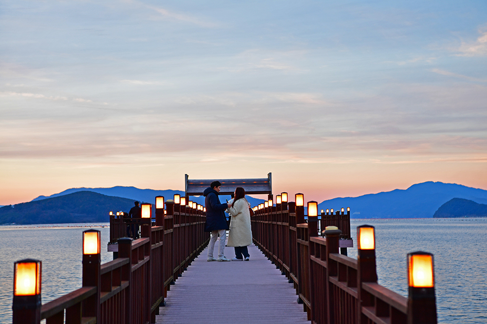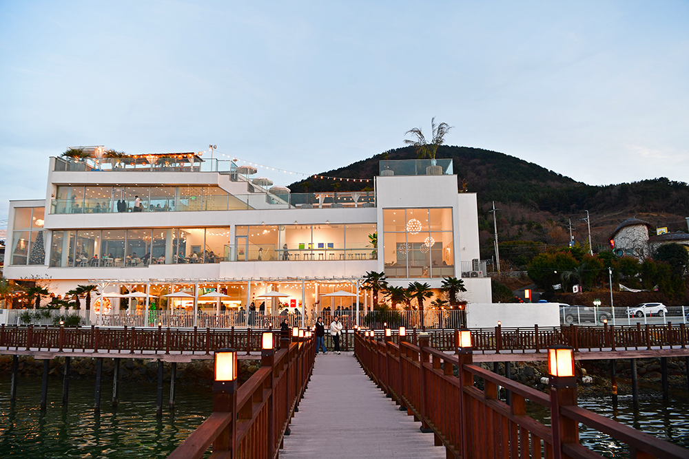 카페를 나와 바닷가에 있는 나무데크 길을 걸어 봅니다. 데크에도 조명이 불을 밝힙니다. 조명 빛은 아직 남아있는 석양 빛과 어우러져 멋진 분위기를 연출합니다. 이런 풍경이라면... 당연히 인생샷 한컷 담아야 합니다. ㅎㅎ