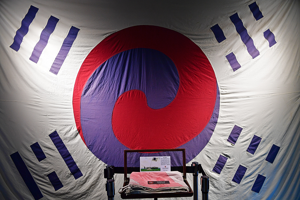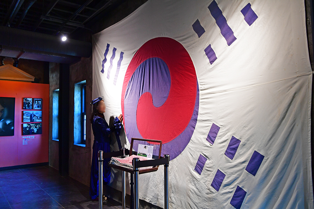 이어서 '한성전기' 건물에 도착했습니다. 건물 안으로 들어가보니 1층에서 음료를 판매합니다. 2층으로 올라가니 대형 태극기가 걸려 있습니다. '데니 태극기'라고 하는데, 우리나라에서 가장 오래된 태극기로 추정된다고 하는군요~