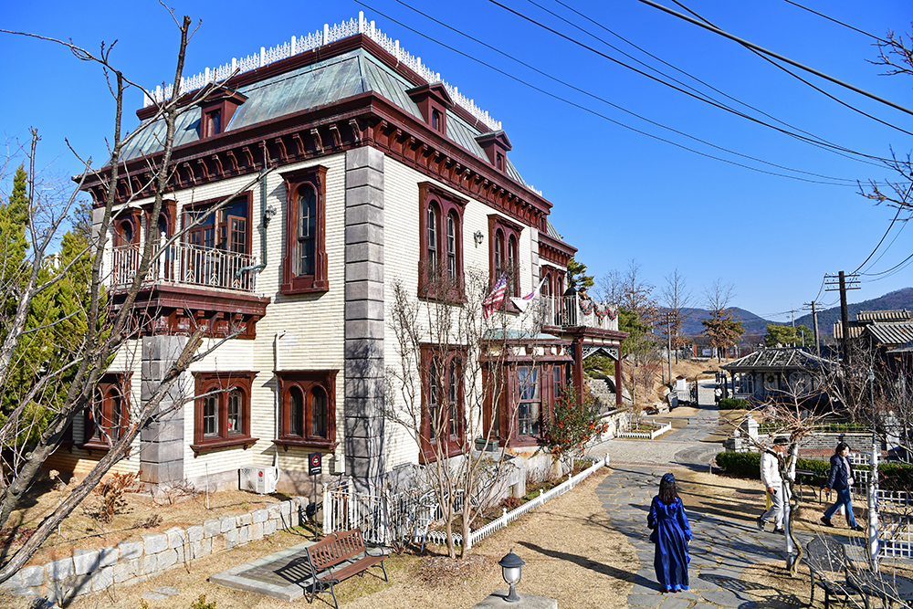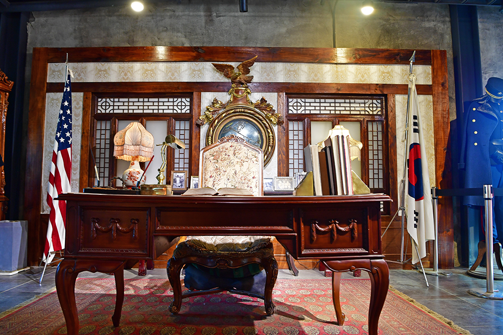 태극기 맞은 편에 유진초이 집무실이 있습니다. 많은 분들이 사진을 담는 포토존 역할을 합니다. 드라마에서 사용된 미공사관과 유진초이 집무실은 충북 청주의 '운보의 집'에서 촬영했습니다. 아마도 그곳의 시설을 그대로 옮겨 온듯 합니다. ㅎ