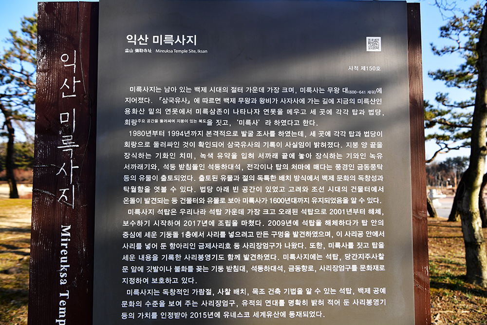 대형 주차장이 있어 주차는 수월합니다. 입구에는 ‘국립 익산박물관’이라 씌여진 큰 이정표가 반겨줍니다. 먼저 이정표 옆 안내판을 읽어 봅니다. 백제 무왕 시절에 건립된 익산 미륵사지는 남아있는 백제시대의 절터 가운데 가장 큰 규모라고 합니다. 지금은 사적 제150호로 지정 관리 중에 있습니다.