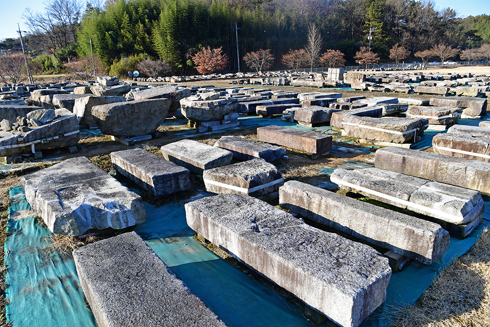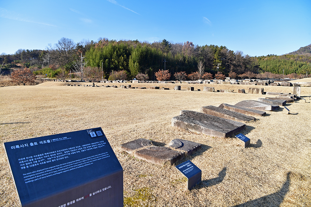 석탑으로 향하는 길을 따라가니, 한쪽에 많은 석조물이 있습니다. 미륵사지 발굴조사에서 출토된 석조물들 입니다. 대부분 동원 9층 석탑 등에서 나온 것들로, 60여점을 따로 전시하고 있습니다.
