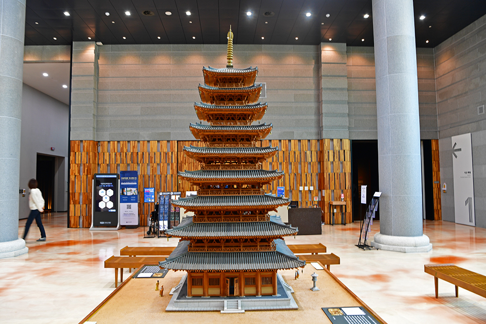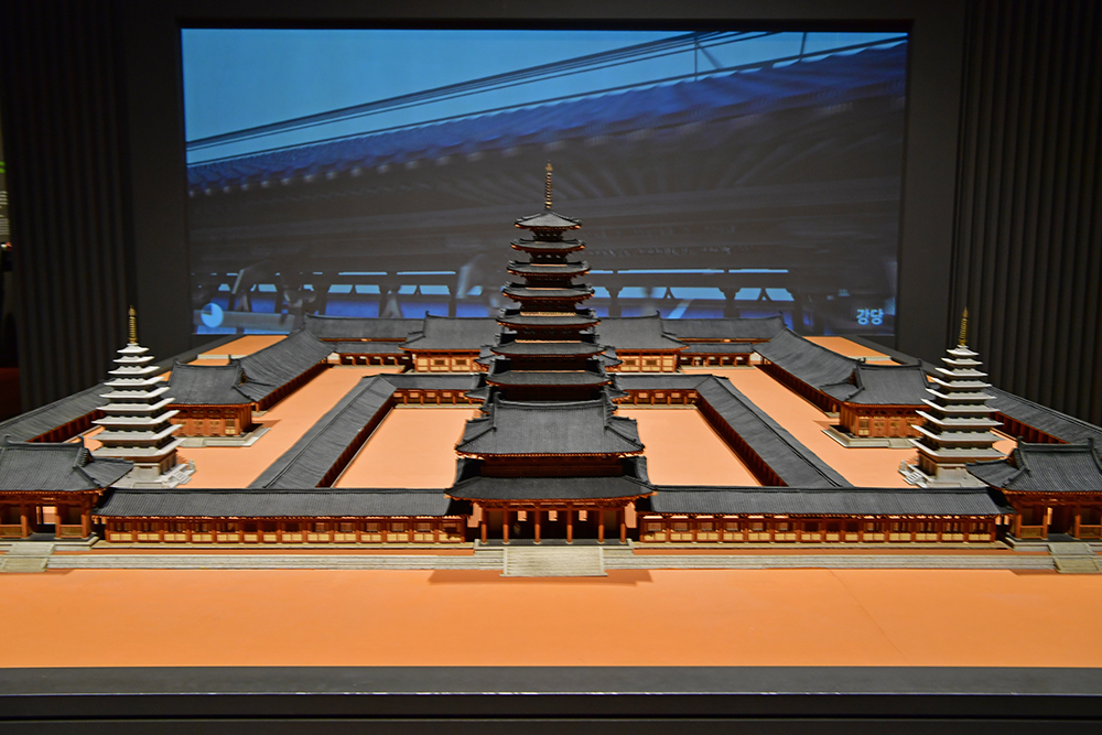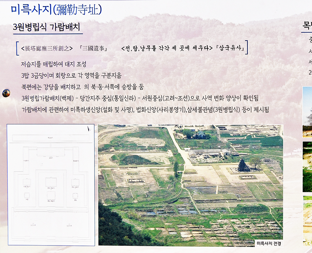 발굴 현장의 안내문을 보니 사찰배치가 좀 독특했습니다. 미륵사지는 '3원병립식' 가람배치를 따랐다고 합니다. 내용이 좀 어렵지만, 쉽게 이해하자면 '3탑 3금당'이라 하여 탑과 금당을 한 묶음으로 배치했다는 설명입니다. 그럼 미륵사지는 어떤 모습일까? 미륵사지를 복원한 모습은 박물관에서 확인할 수 있었습니다. ㅎ