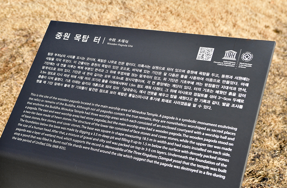 석탑과 서원 금당터를 둘러본 후 옆쪽 석탑으로 향하는데, 도중에 '목탑 터' 안내판이 있습니다. 내용을 살펴보니, 중원에는 목탑을, 서원과 동원에는 각각 석탑을 세웠나 봅니다. 세월의 풍파 속에 목탑이 없어져 그 모습이 궁금했습니다. 하지만 국립익산박물관에 그 모형이 있어 아쉬움을 달래 수 있었습니다. ㅎ