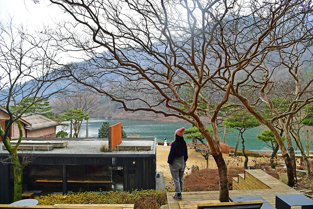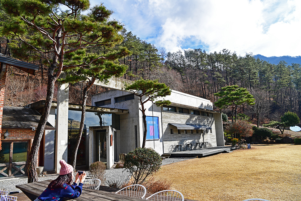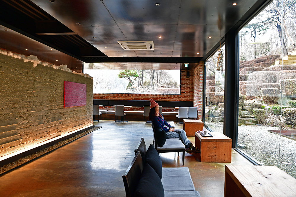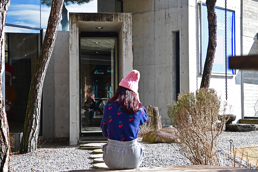 갤러리 카페라서 그런지 건물도 참 독특합니다. 건물 안으로 입장하기 전에 건물 배경으로 전속모델을 앞세워 봅니다. ㅎ