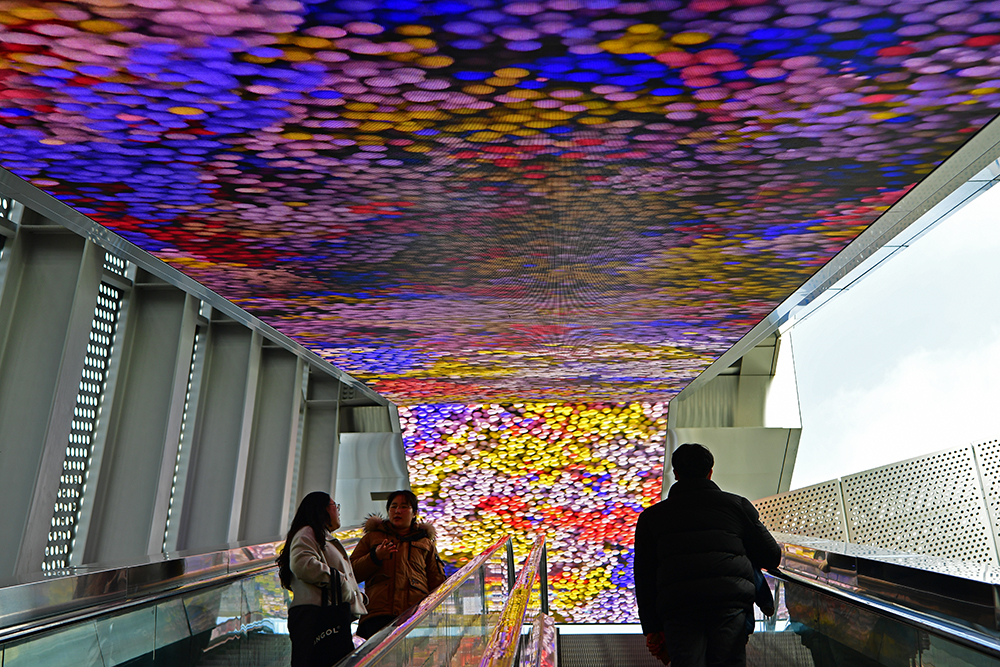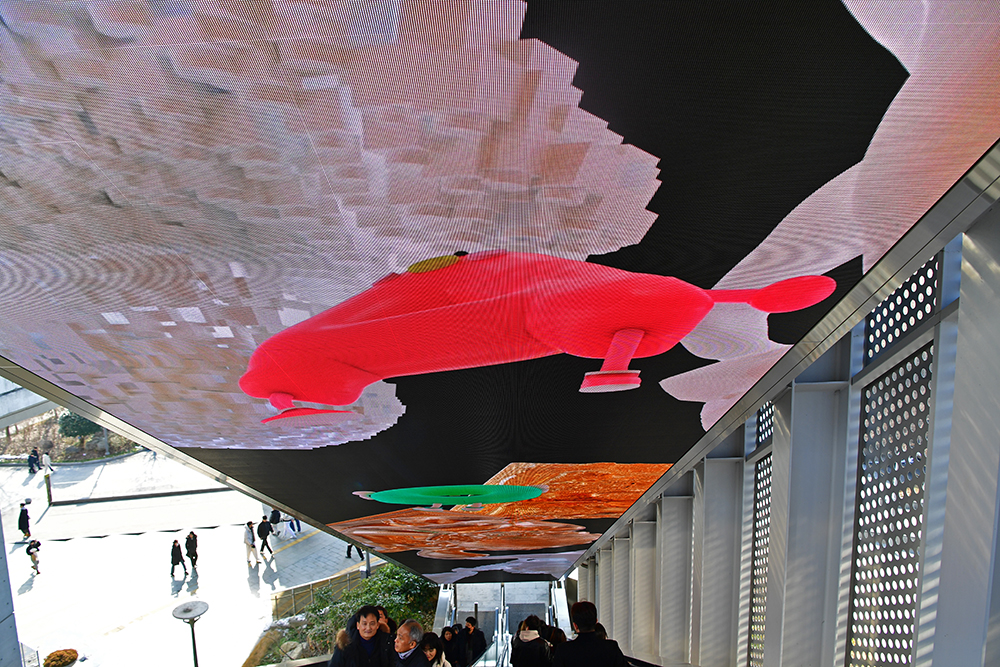 광장으로 가기 위해 에스컬레이터를 이용했습니다. 천장에서 멋진 미디어아트가 펼쳐집니다. 지상으로 가는 짧은 시간이지만, 눈뗄수 없는 장면에서 색다른 즐거움을 느껴봅니다. ㅎ