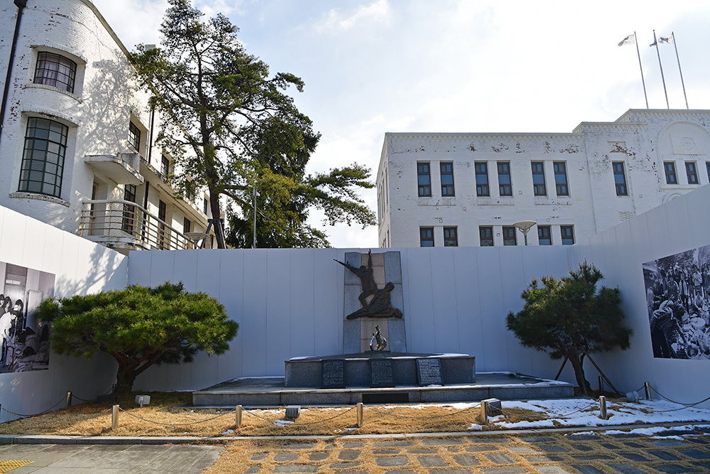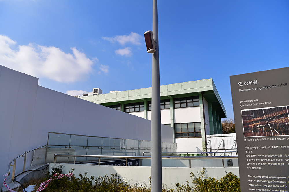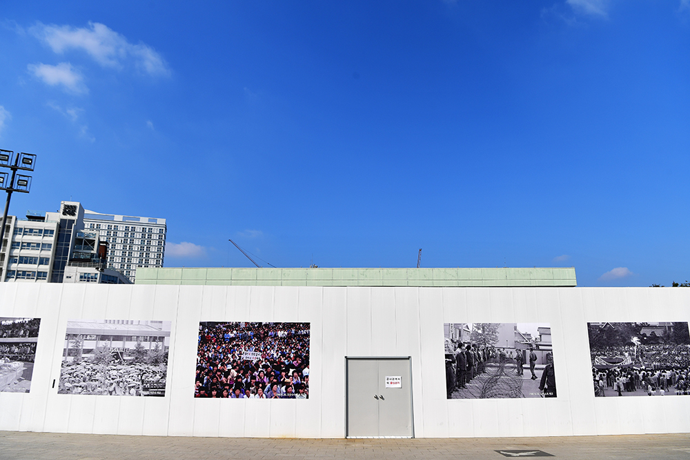 5.18 민주광장에 도착했습니다. 먼저 '상무관'을 찾았습니다. 5.18 당시 계엄군에 의해 희생된 사람들의 시신을 안치했던 곳 입니다. 그런데... 상무관 건물은 외벽으로 차단되어 있습니다. 무슨 공사를 하나 봅니다.ㅠㅠ 어쩔수없이 발걸음을 돌려야 했지만, 외벽에 붙어있는 사진을 통해 조금이나마 아쉬움을 달래봅니다.