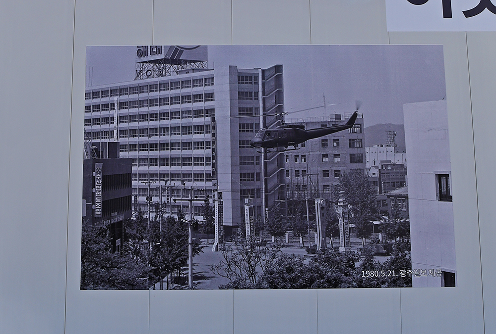 '민주의 종' 바로 앞에 눈에 익은 건물이 보입니다. 조금전 복원공사 외벽에서 본 사진 속 그 건물입니다. 빌딩 옆으로 헬기가 지나가는 모습의 사진입니다. 사진속 건물은 '전일빌딩'입니다. 5.18 광주민주화운동 당시 헬기 사격 흔적이 남아 있는 곳입니다. 5.18 민중항쟁 사적 28호로 지정 관리되고 있습니다.