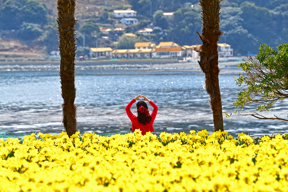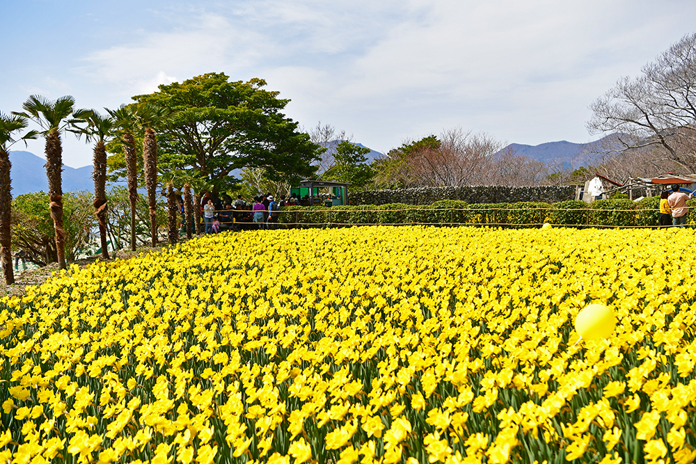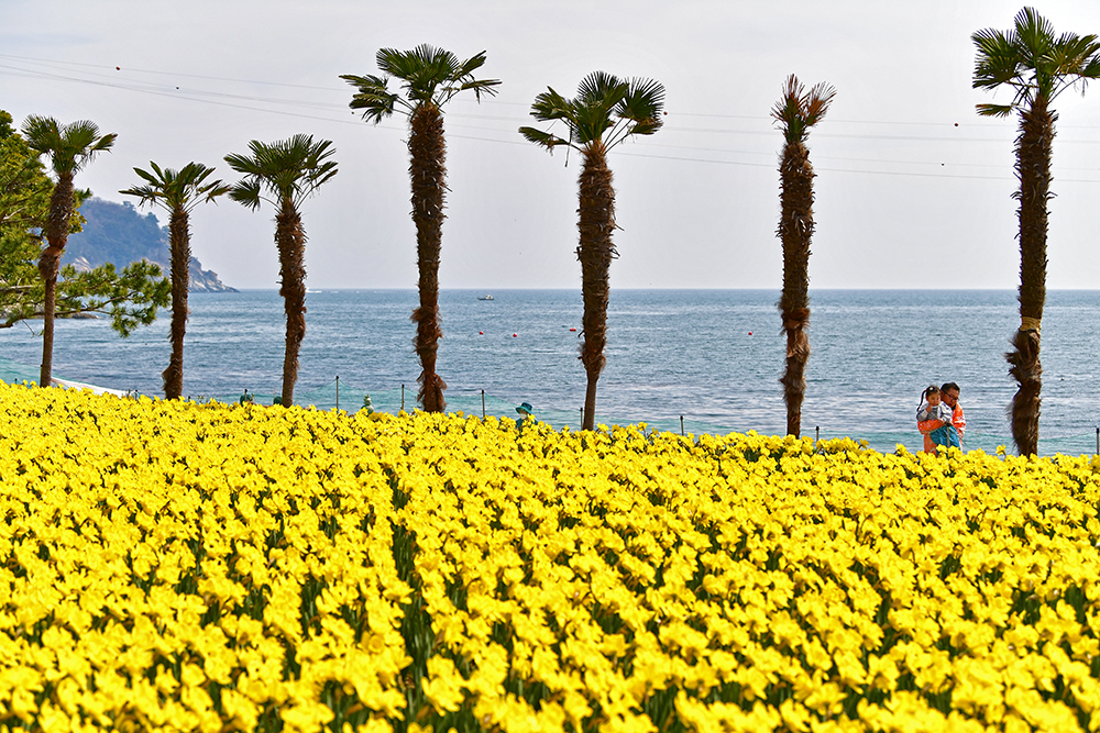올해는 군락지 속에서 수선화를 즐길 수 있는 코스가 생겼습니다. 야자수 나무와 어우러진 노란 수선화의 모습을 보니 이국적인 분위기를 느껴집니다. 덩달아 전속모델도 신이 났습니다. ㅎㅎ