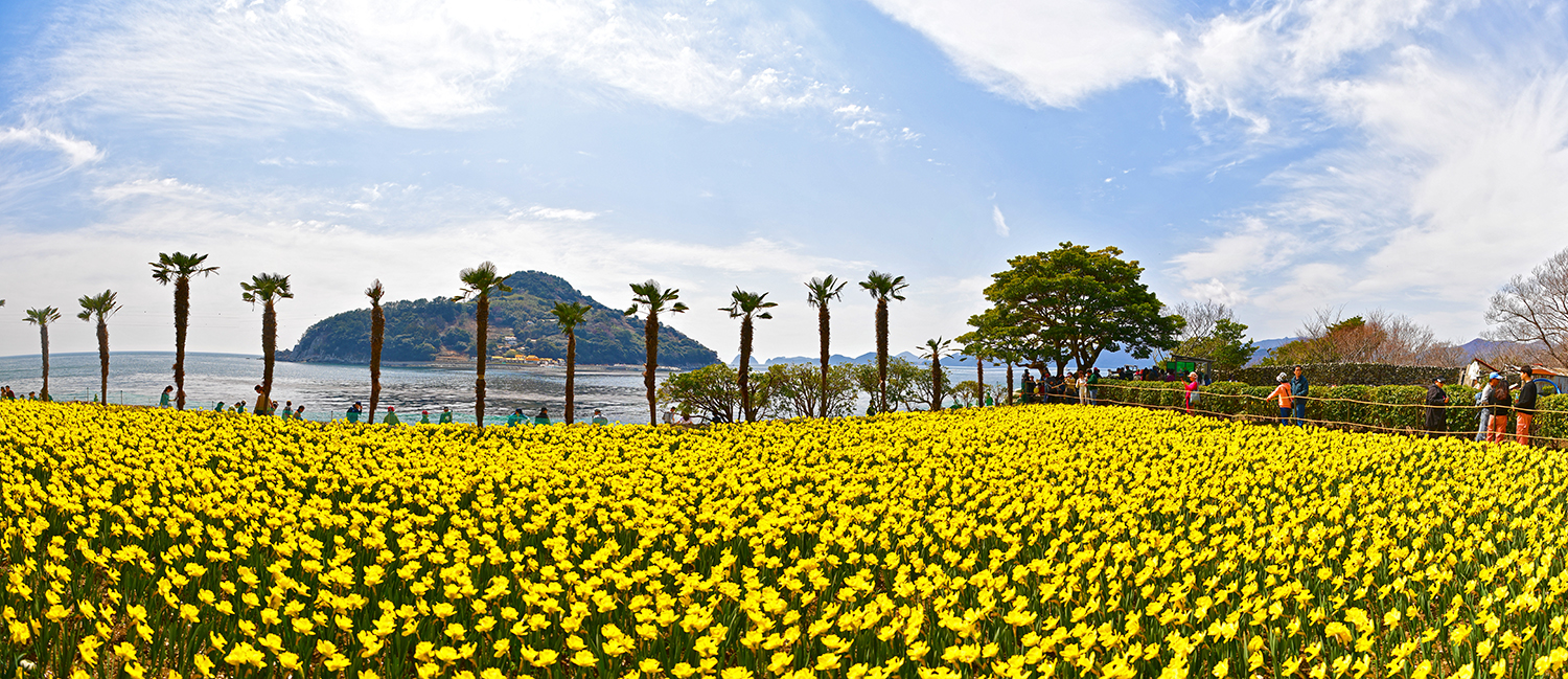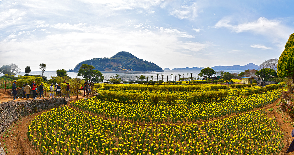 드디어 수선화 군락지에 도착했습니다. 올해 수선화는 예년보다 크고 생육상태가 아주 좋습니다. 거제시가 새로 심은 덕분입니다. 노란 물결이 넘실거리는 군락지 전경부터 파노라마로 즐겨 봅니다. ㅎ